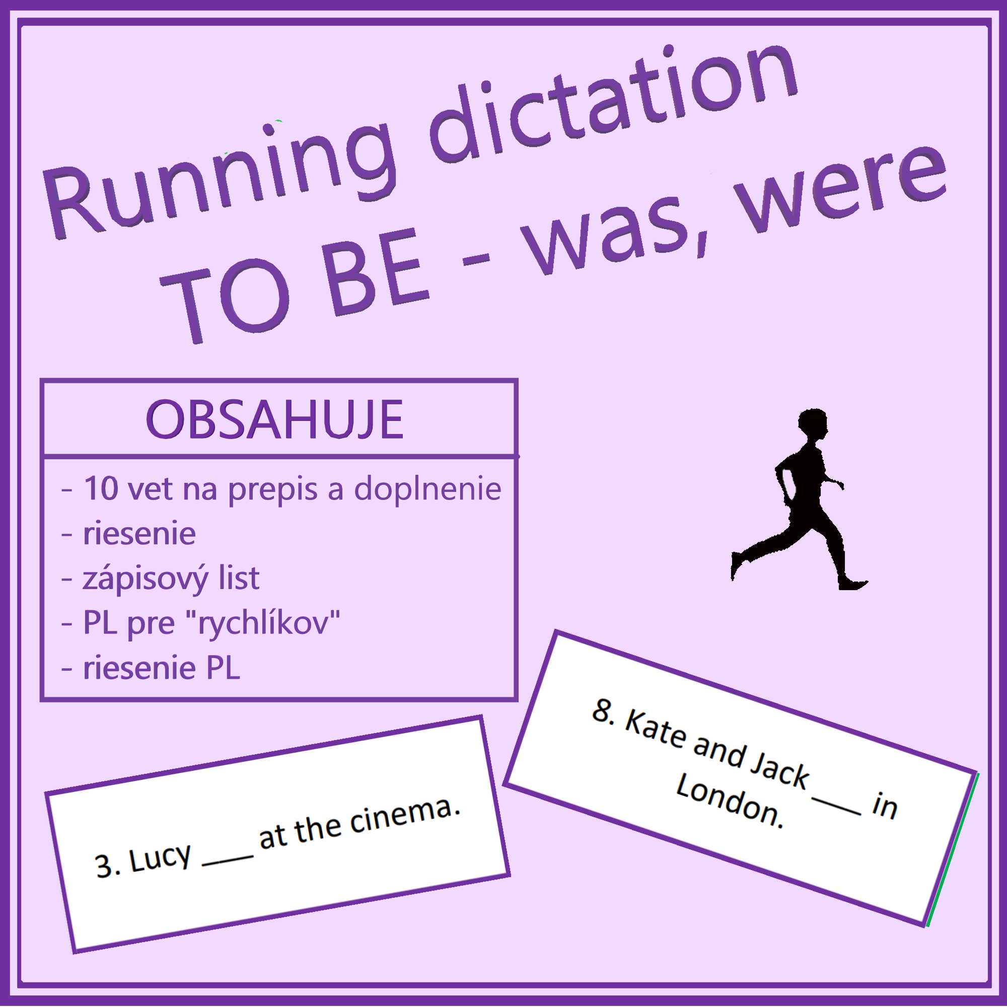 Zábavná aktivita na precvičenie slovesa BYŤ v minulom jednoduchom čase (pasca simple). Vety sú jednoduché, obsahuje kladné vety a pár otázok. Aktivita precvičuje sloveso byť, ďalej aj pamäť, rozprávanie/výslovnosť a písanie v angličtine. Žiaci pracujú v skupine či dvojici. Karty rozmiestnime po triede alebo na chodbe. Jeden zo skupiny vyrazí, prečíta si vetu, doplní správny tvar slovesa, skúsi si ju zapamätať, vráti sa a nadiktuje ju spolužiakovi. Takto pokračujú až k poslednej vete, prípadne sa v priebehu prehodia.