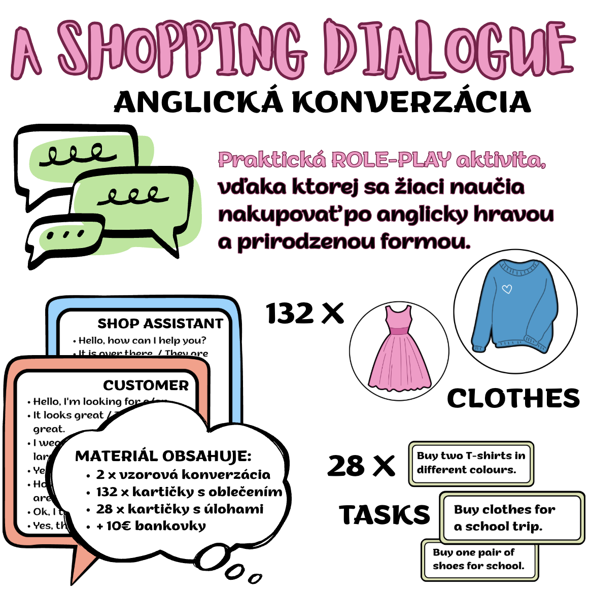 PRIEBEH AKTIVITY: Žiaci si rozdelia vzorové konverzácie a vyberú si, kto bude predavač a kto kupujúci. Počas konverzácie si vyberajú obrázky oblečenia a podľa nich vytvárajú kompletnú dialógovú situáciu podľa vzorovej konverzácie. Pre podporu môžu používať kartičky s úlohami, ktoré určujú, čo majú kúpiť. Aktivita rozvíja používanie základných fráz ako „I am looking for…“, „How much is it?“ alebo „How can I help you?“. Platba sa realizuje papierovými peniazmi v desiatkach podľa ceny, ktorú určí predavač.