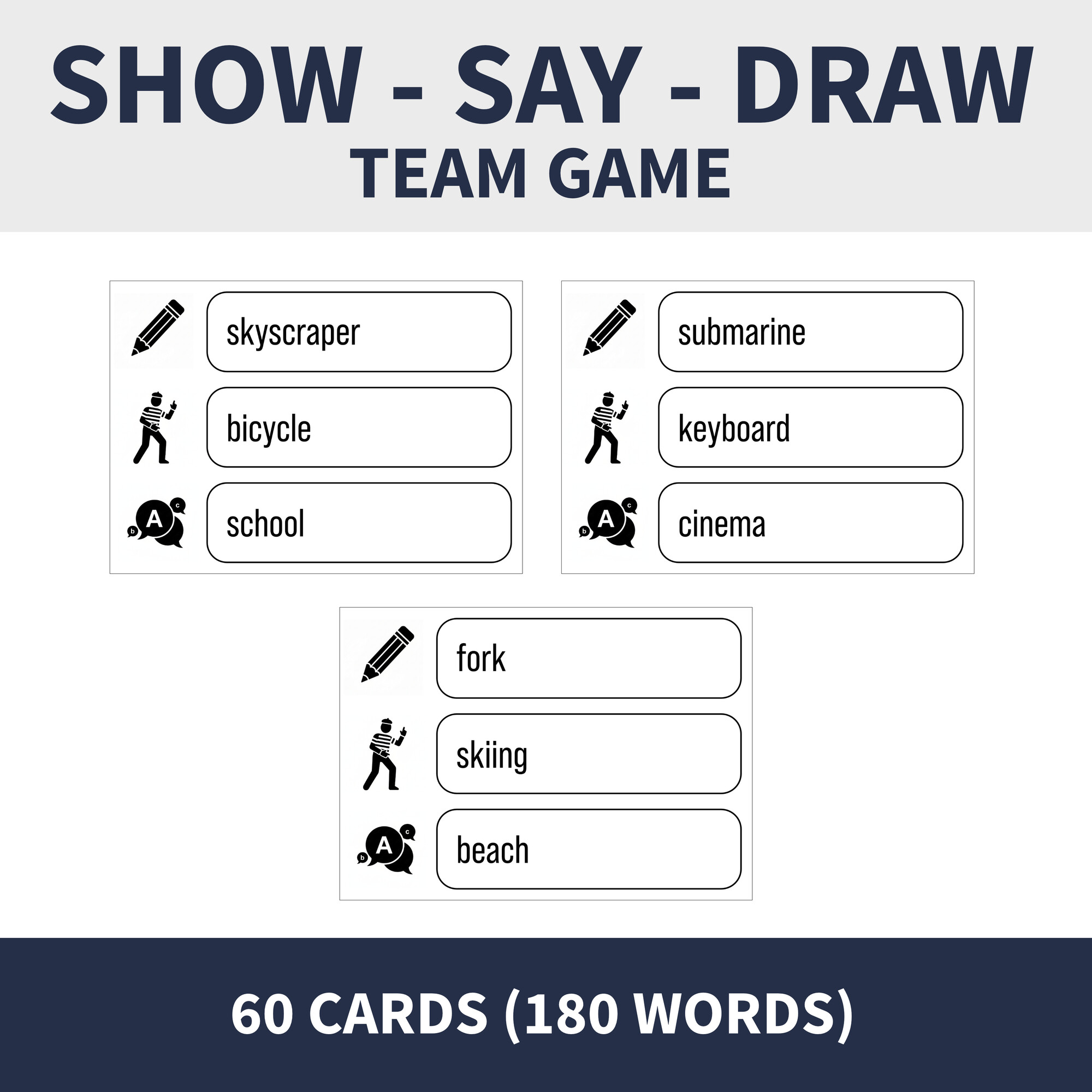 Popis: úlohou hráča v tíme je napovedať (slovami, kresbou, pantomímou) spoluhráčom slovo na karte - mód hry je možné ľubovoľne prispôsobiť (a - jeden hráč predstaví všetky slová, b - hráč si vyberie slovo podľa disciplíny, c - v každom kole sa hrá iná disciplína a pod.)