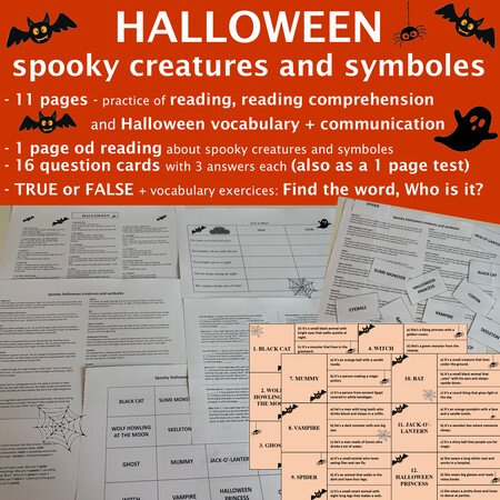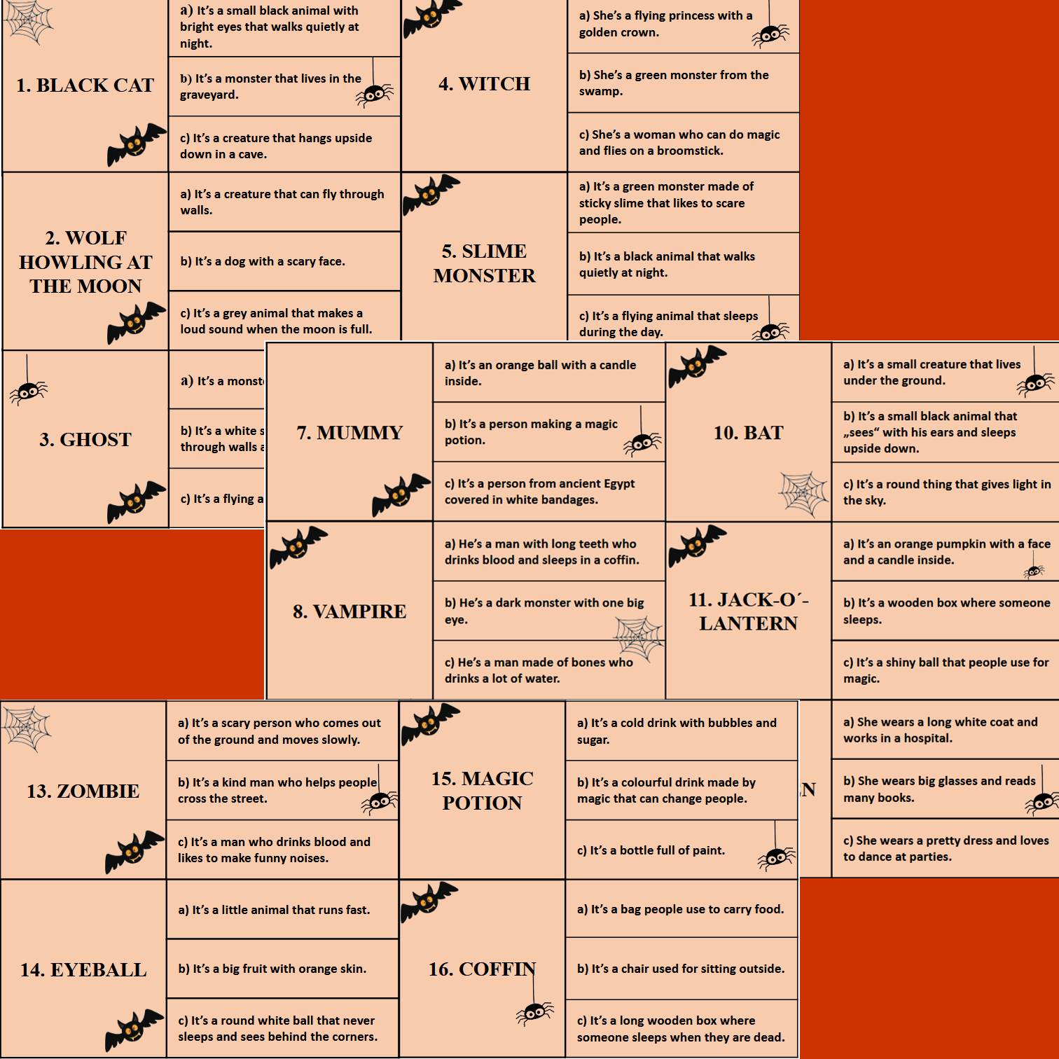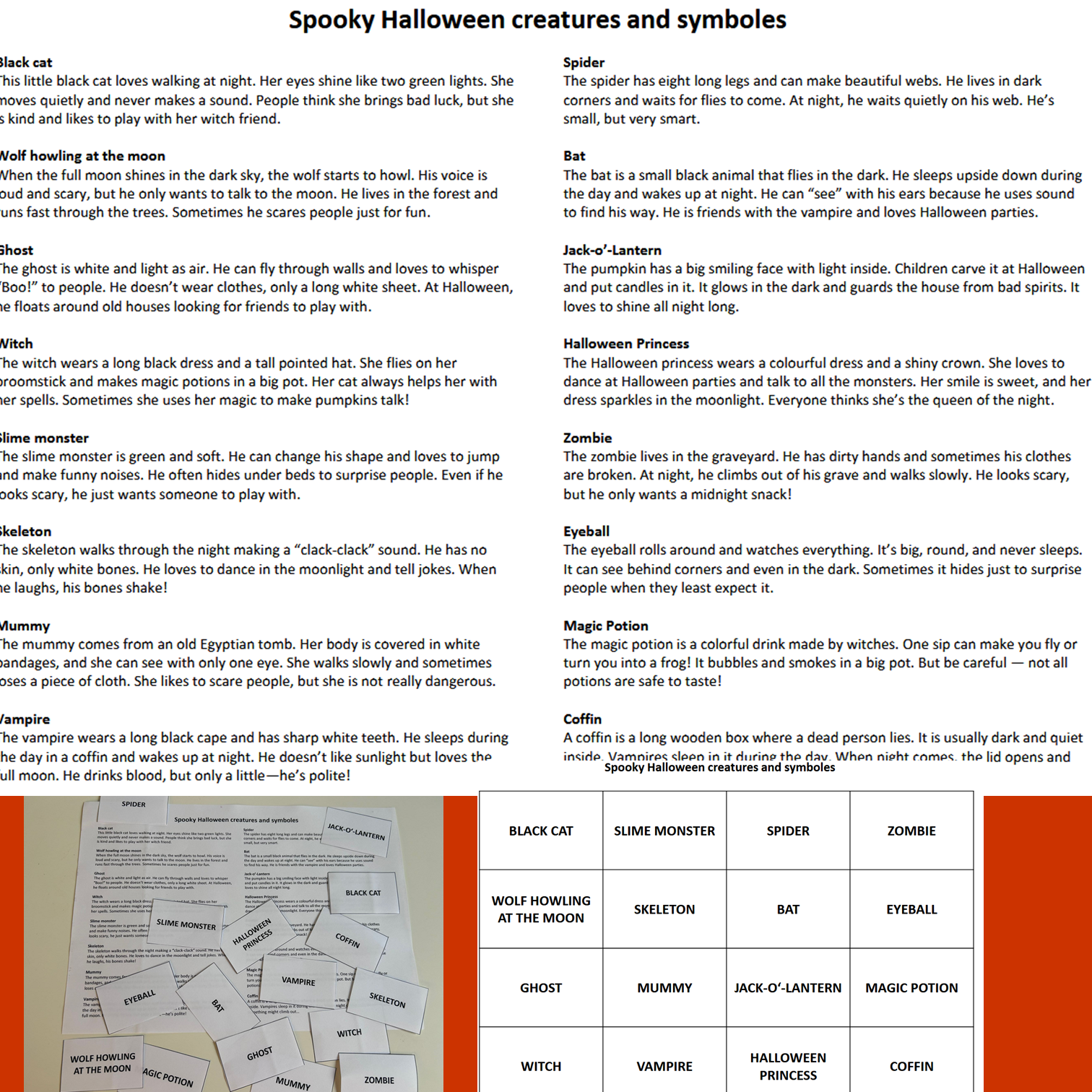 Touto aktivitou spestríte deťom hodinu, uvediete ich do témy Halloween a precvičíte s nimi čítanie, pamäť či orientáciu v texte, ako aj komunikáciu (opis postavy/symbolu a hádanie, kto je kto/čo). Zároveň si precvičia anglické slovíčka k danej téme.
