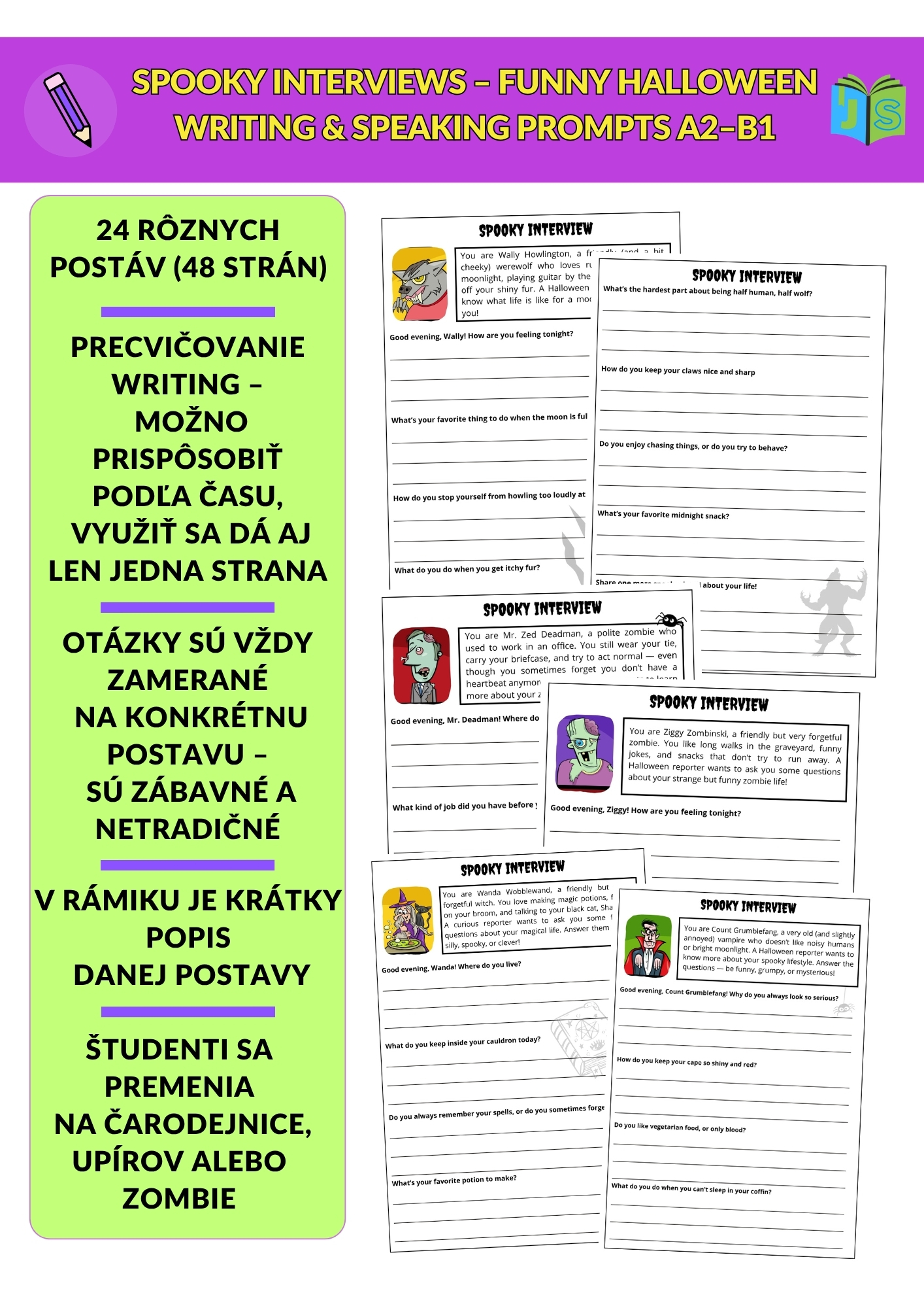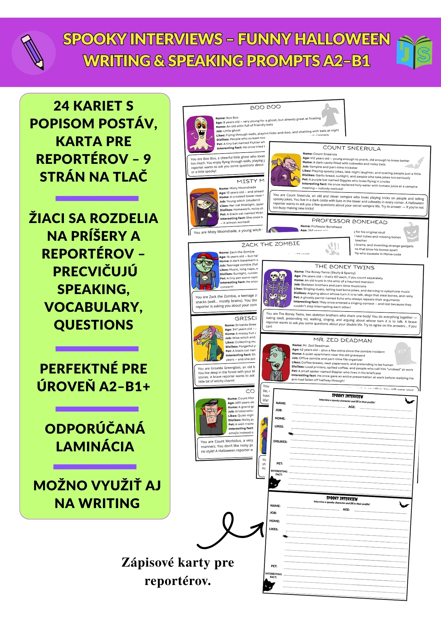 Žiaci sa premenia na čarodejnice, upírov či zombíkov a odpovedajú na otázky reportéra – rozvoj písania. - 9 strán kartičiek pre spooky interviews – príšery a reportérske zápisové karty