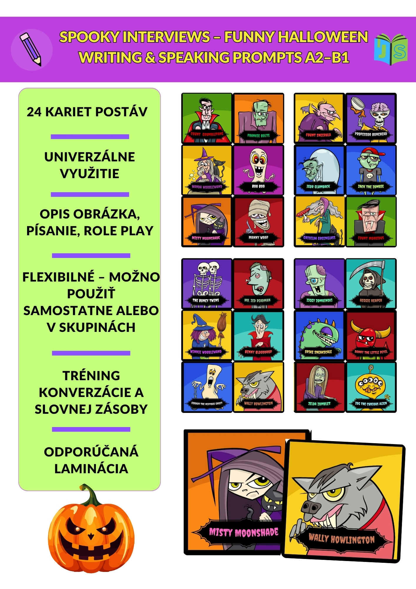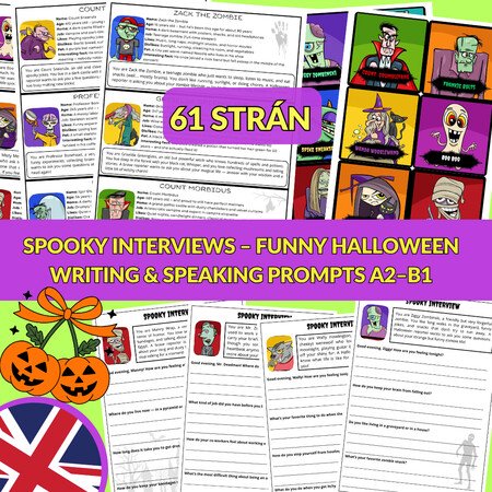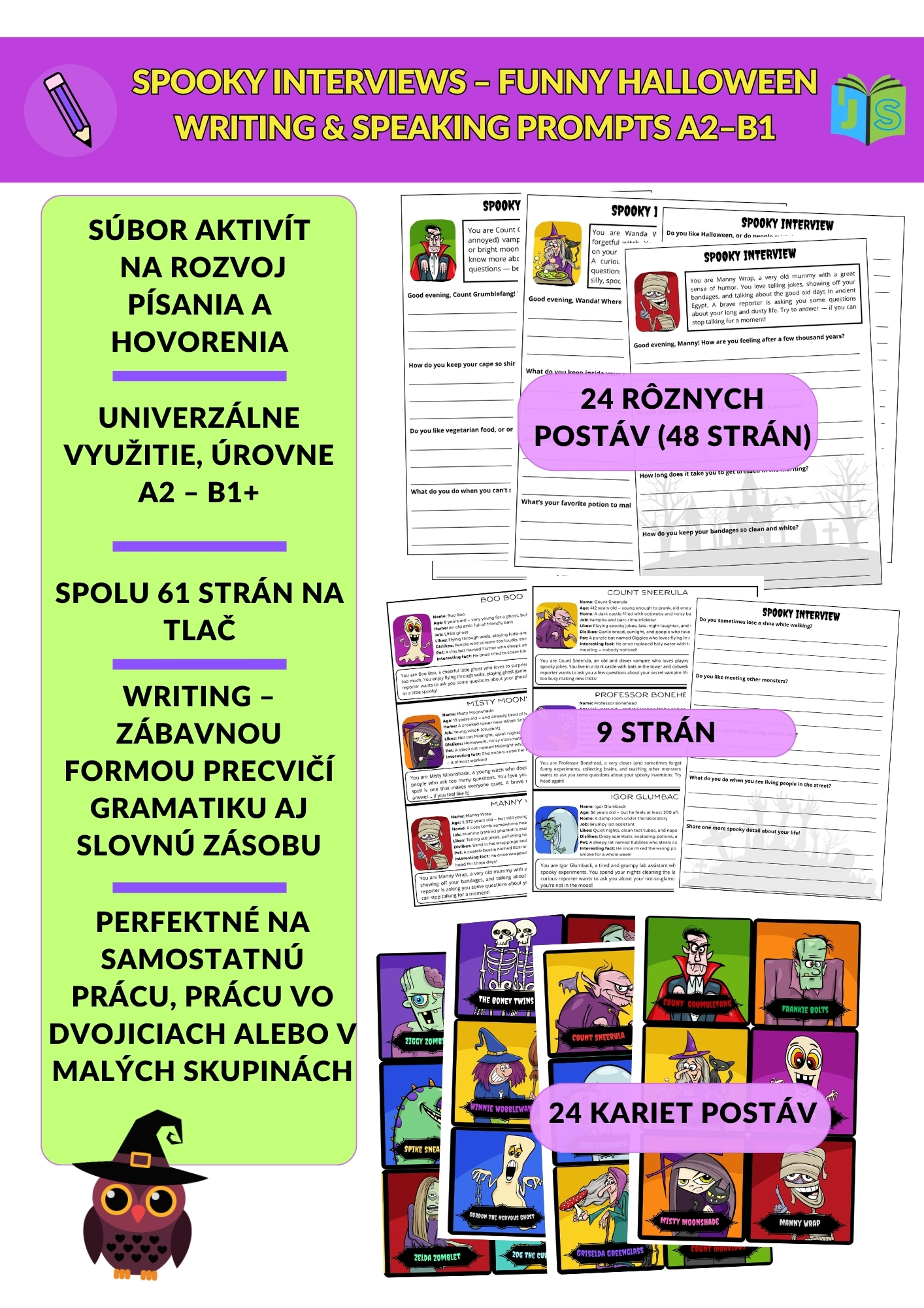 Spolu 61 strán na tlač, vhodné pre úroveň A2–B1 (s možnosťou rozšírenia do B2). Ideálne pre konverzačné hodiny, projekty, tematické halloweenske lekcie či kreatívne písanie.