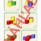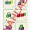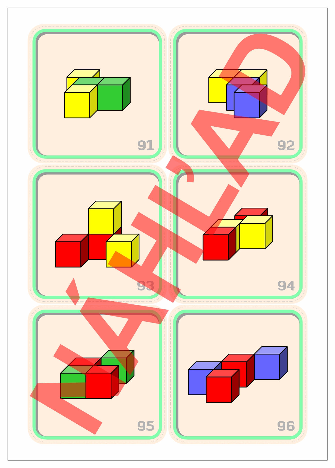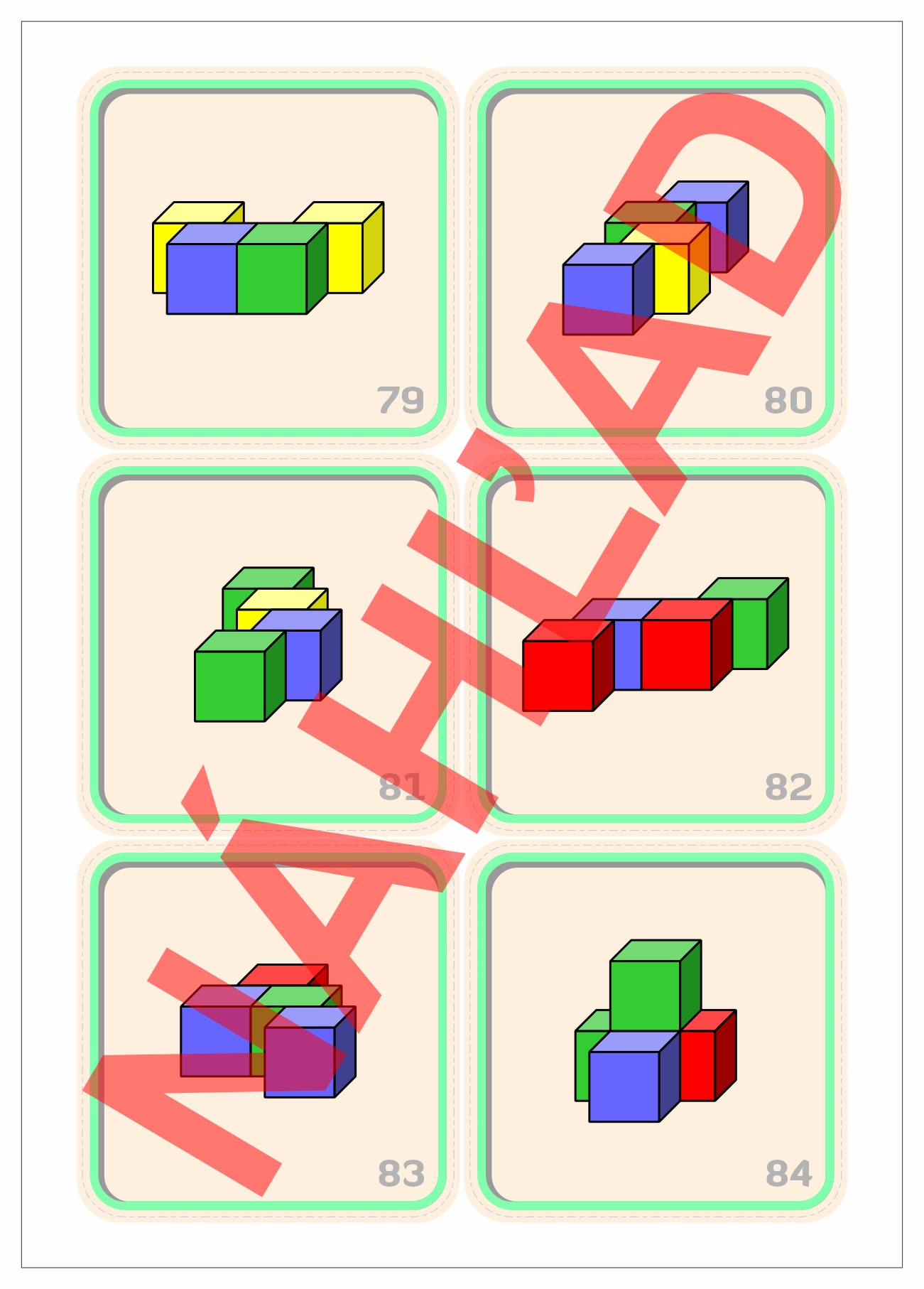 - 102 kartičiek s vyobrazenými stavbami z kociek v 2-3-4-farebných kombináciách