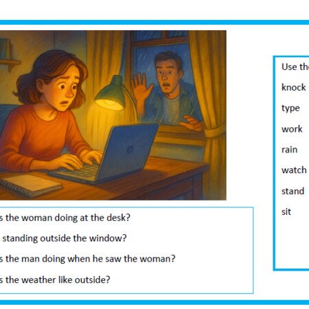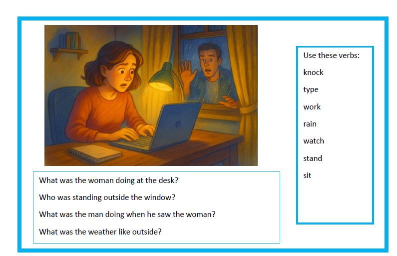 - Odpovedať na otázky pomocou viet v Past Continuous (čo sa práve dialo) a Past Simple (čo sa stalo).