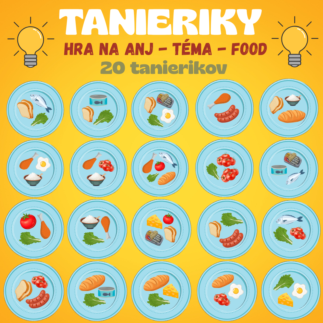 Hra TANIERIKY - rozvíja zábavnou formou slovnú zásobu v anglickom jazyku na tému FOOD. Učiteľ môže tanieriky využiť na zopakovanie učiva, alebo na preskúšanie slovíčok. Žiaci si môžu vytiahnuť jeden tanierik a pomenovať jedlo na ňom, alebo môžu povedať, čo z tanierika majú alebo nemajú radi. Všetko samozrejme v anglickom jazyku. Zahrať sa možete aj hru na stolovanie - možností je veľa, fantázii sa medze nekladú.