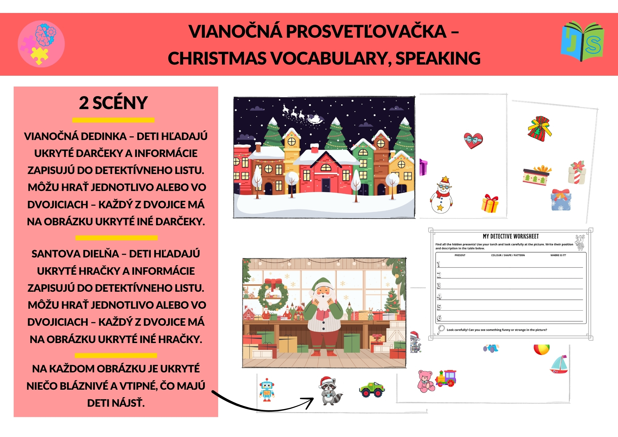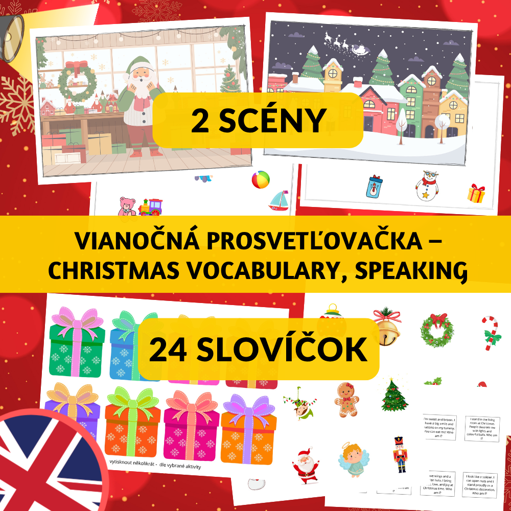 Vianočná prosvetľovačka – Christmas Vocabulary & Speaking je originálna a hravá aktivita na výučbu angličtiny s vianočnou tematikou. Materiál obsahuje dve ilustrované scény (zimná dedinka a Santova dielňa), v ktorých deti pomocou baterky odhaľujú skryté darčeky či hračky a zapisujú svoje objavy do pracovného listu My Detective Worksheet.