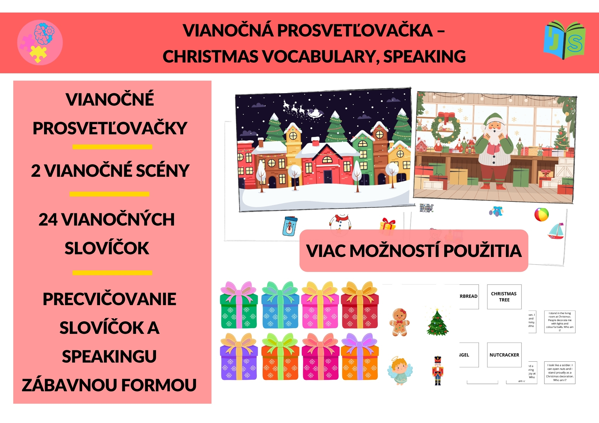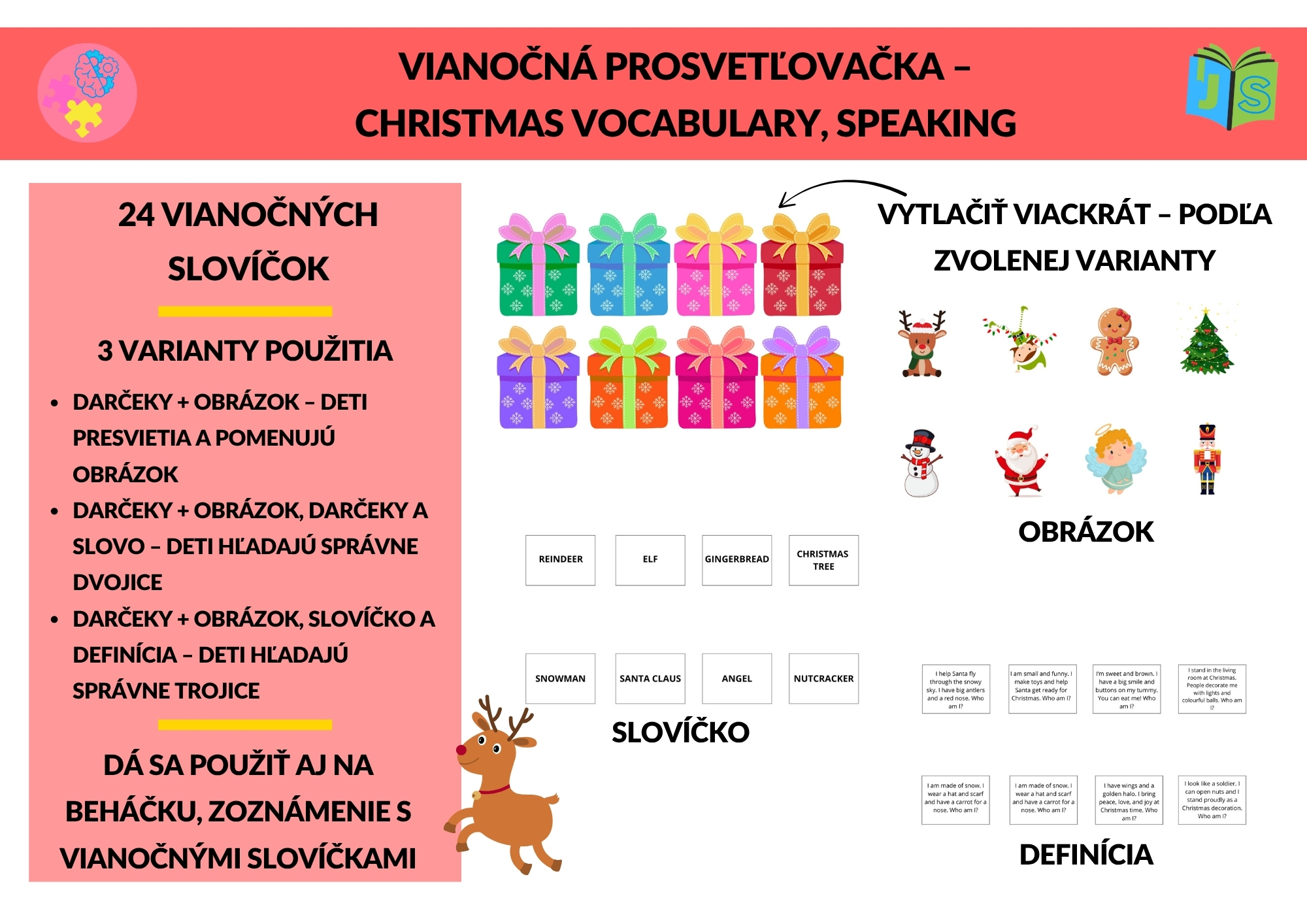 Skvelé pre výučbu angličtiny, jazykové krúžky, projektové dni aj adventnú výučbu. Stačí vytlačiť, zlepiť vrstvy a nechať deti s nadšením objavovať kúzlo Vianoc v angličtine!