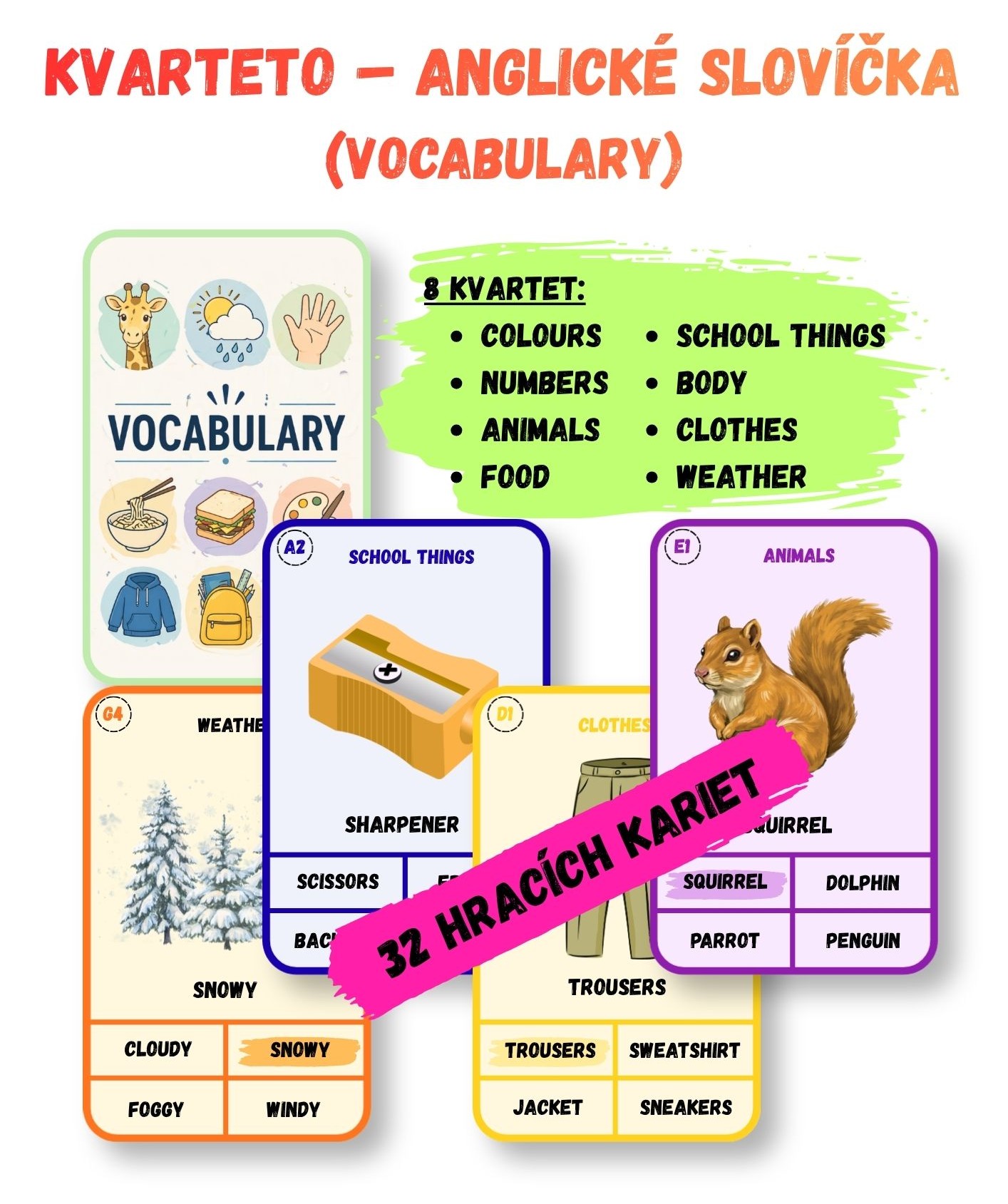 Materiál obsahuje 32 hracích kariet (8 kvartet) so slovíčkami a obrázkami z tém: Colours, Numbers, Animals, Food, School things, Body, Clothes, Weather.