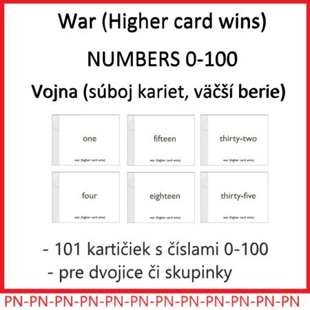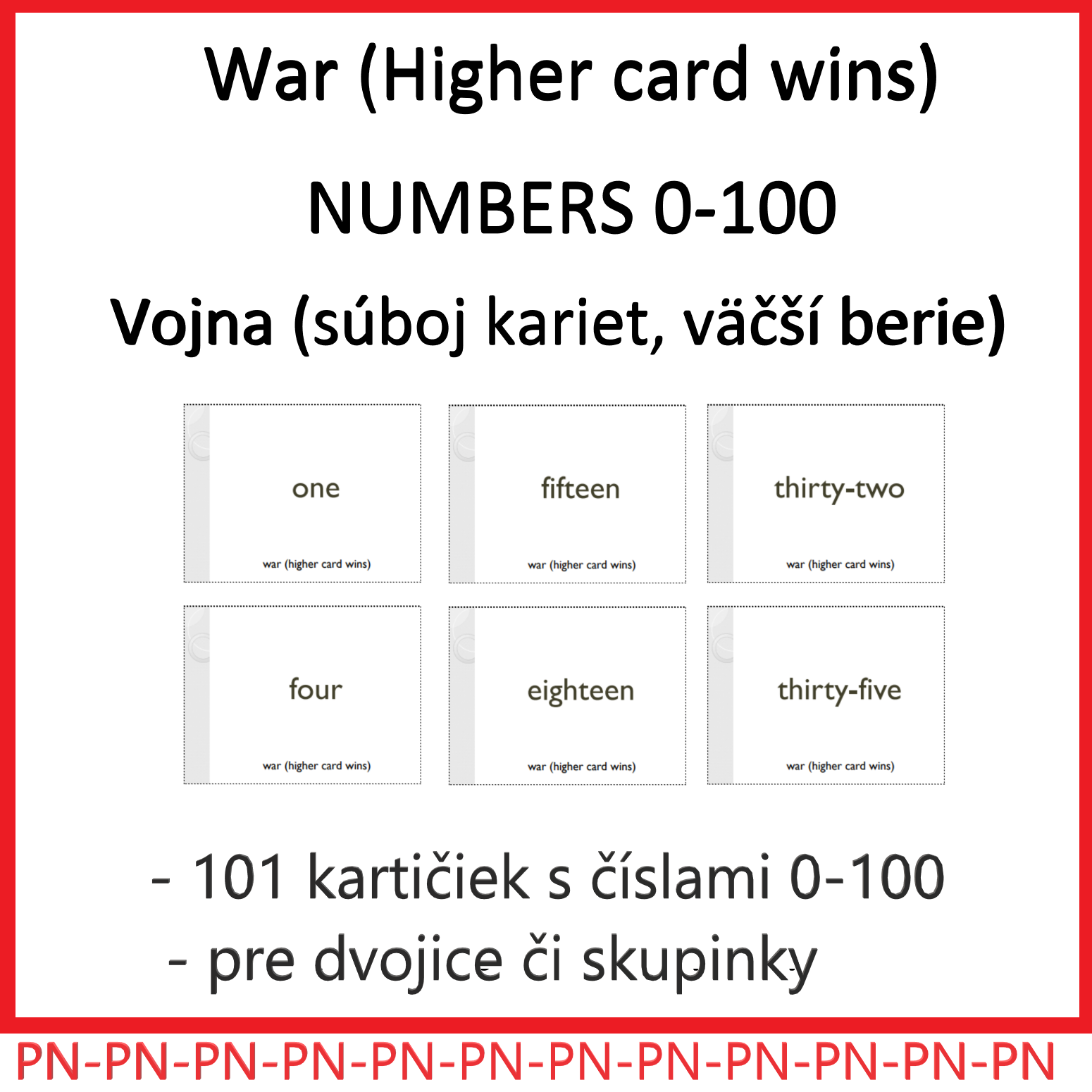 Vojna (súboj kariet, väčší berie) - čísla anglicky War (Higher card wins) - NUMBERS 0-100
