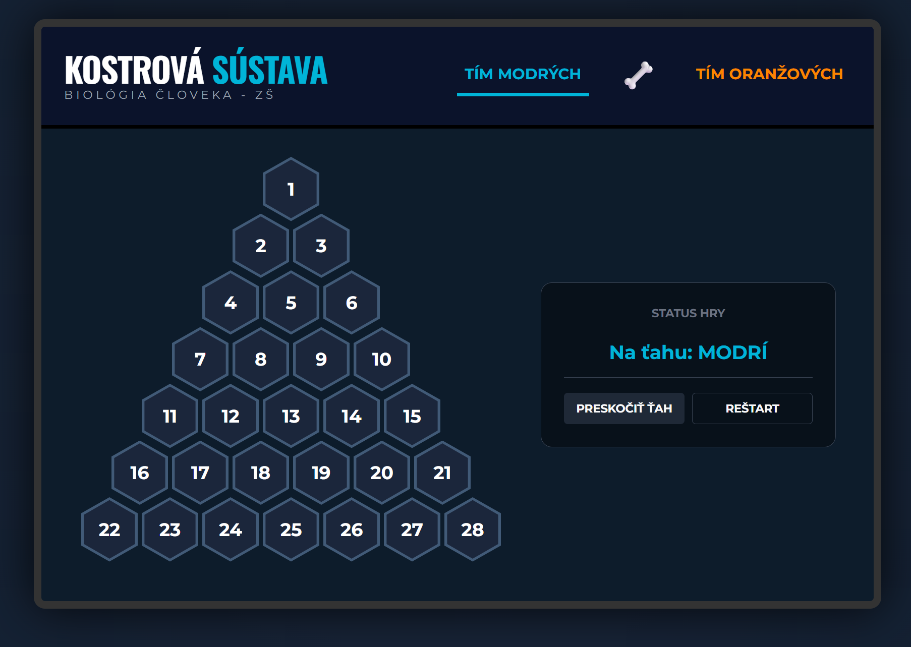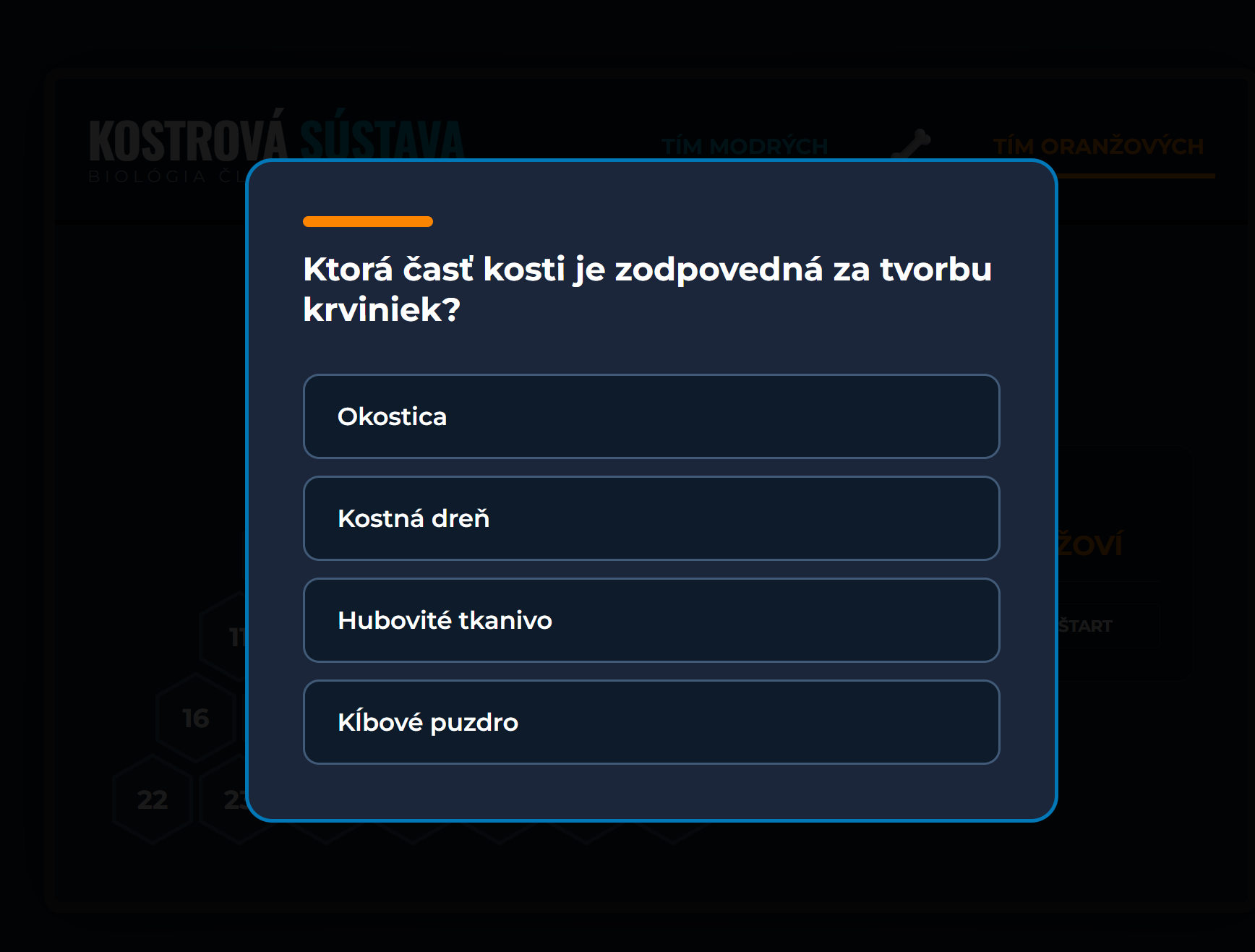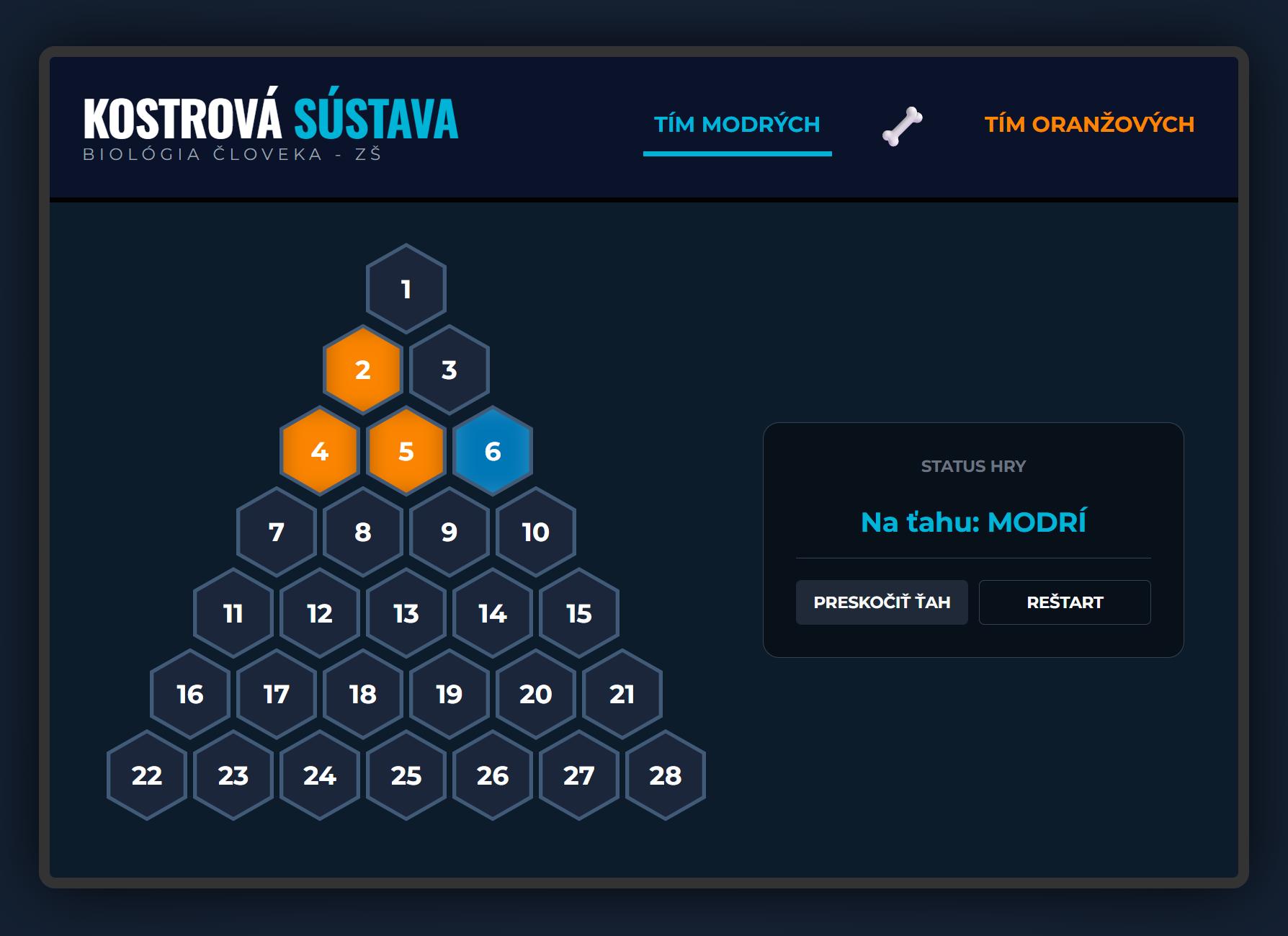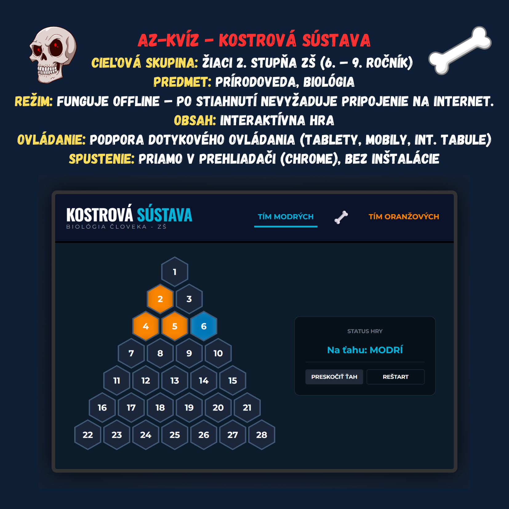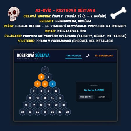 Cieľ aktivity: Precvičiť učivo o kostrovej sústave interaktívnou a vysoko motivujúcou formou, ktorá upevní odbornú terminológiu a podporí spoluprácu v tímoch.