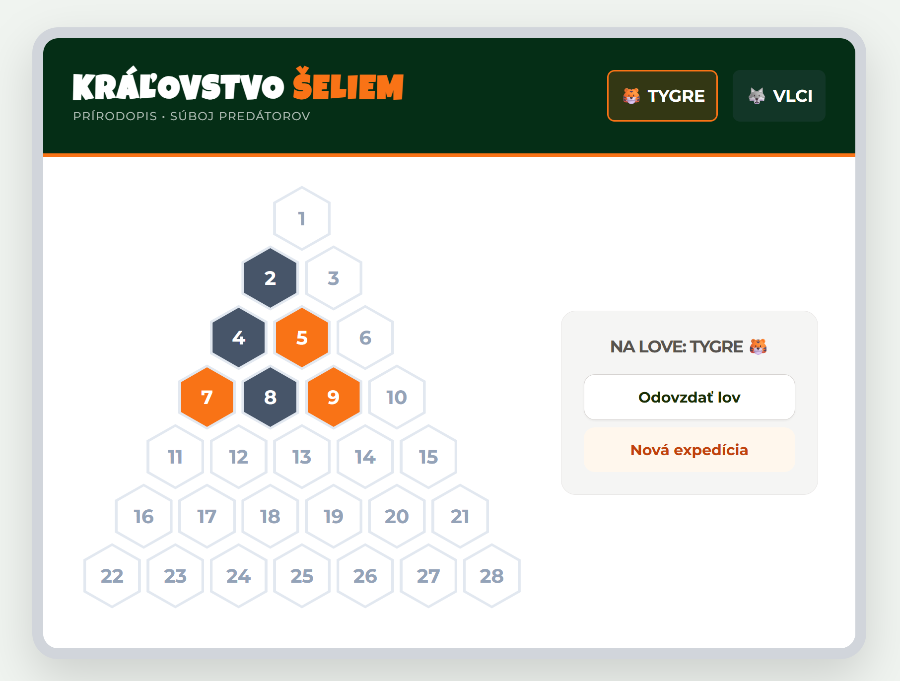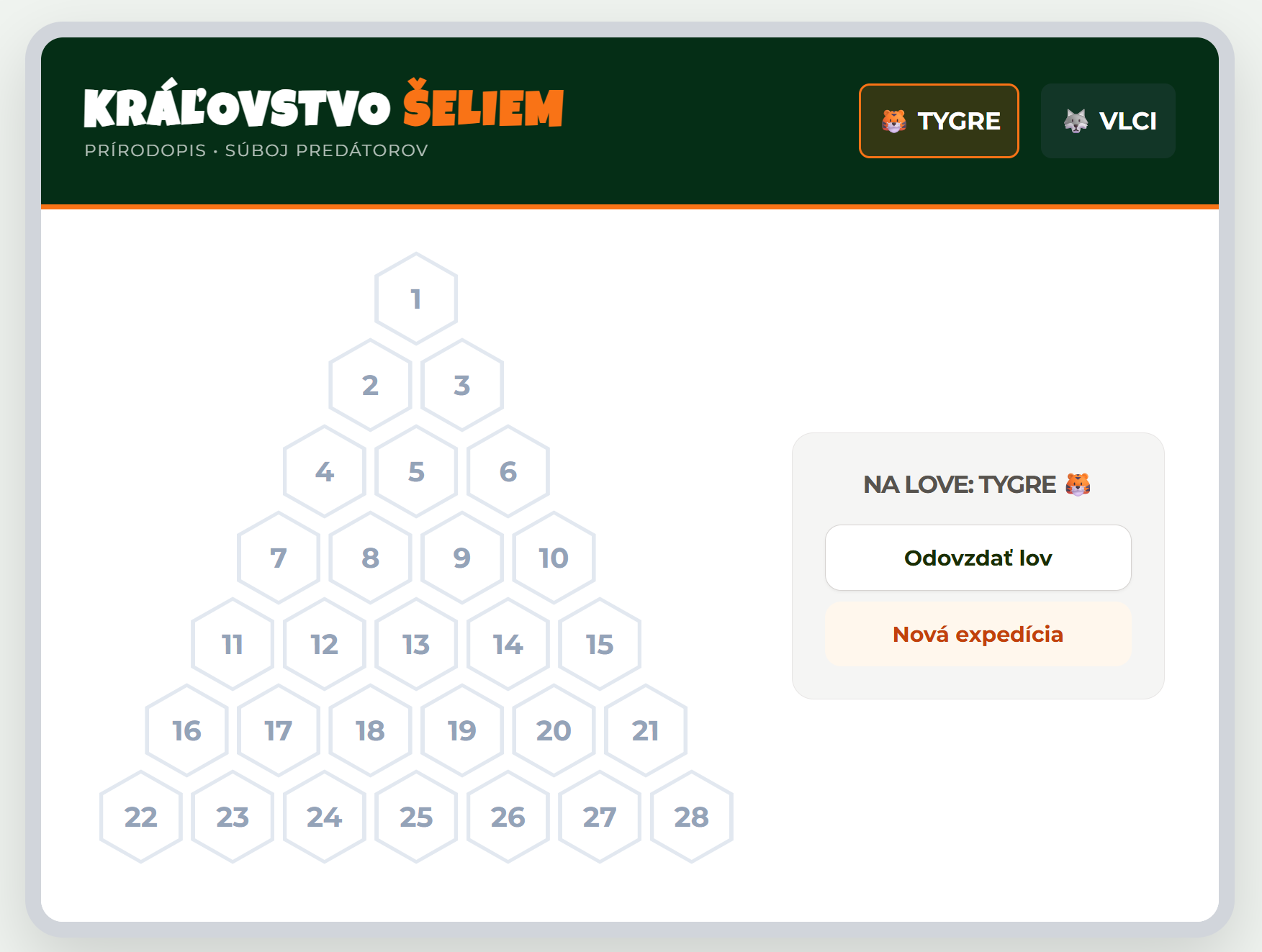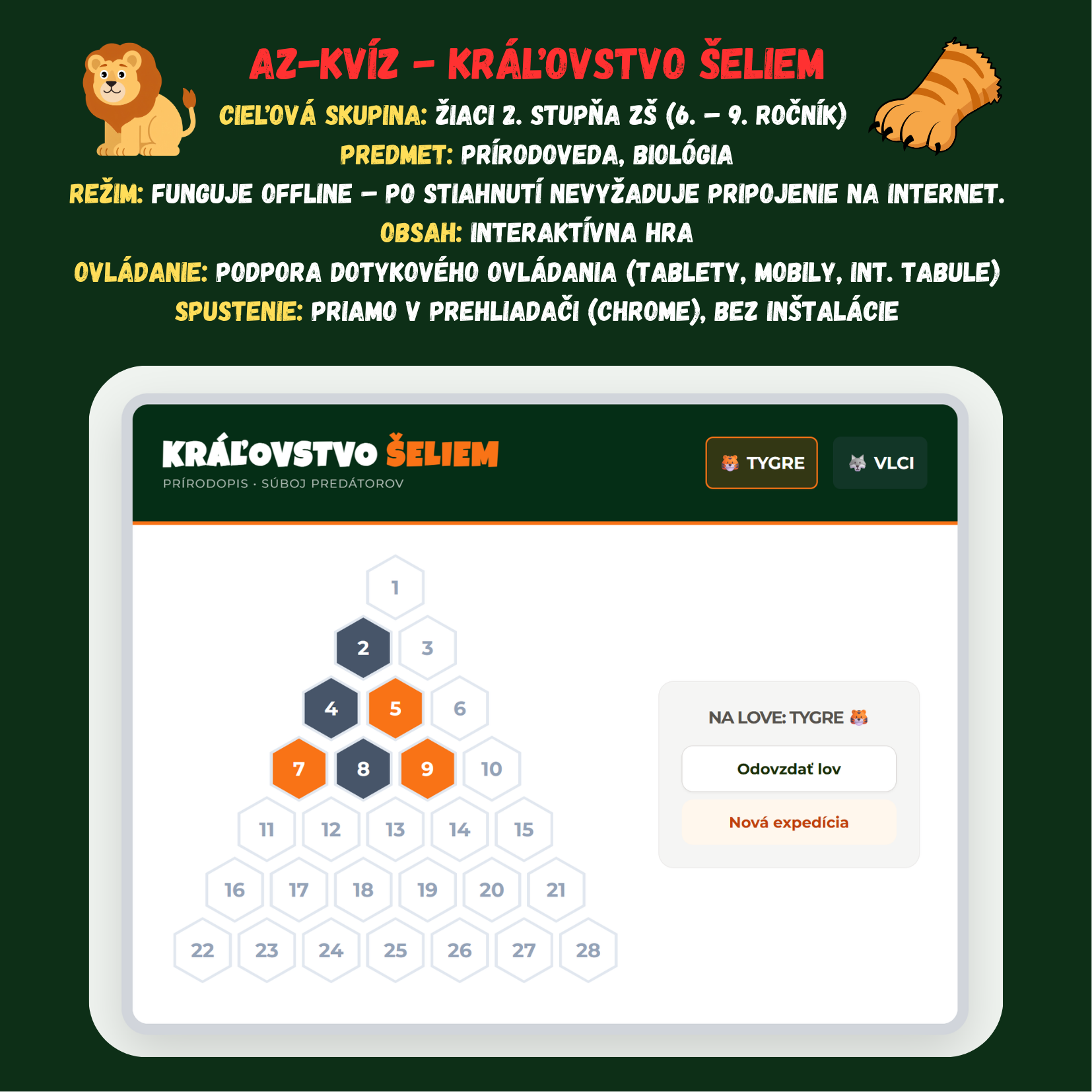 Premeňte hodinu prírodopisu na napínavý súboj medzi Tigrami a Vlkmi! Táto digitálna hra prenáša obľúbený formát AZ-kvízu priamo do vašej triedy. Žiaci sa hravou formou naučia všetko o najväčších predátoroch planéty, ich spôsobe života i rekordoch.