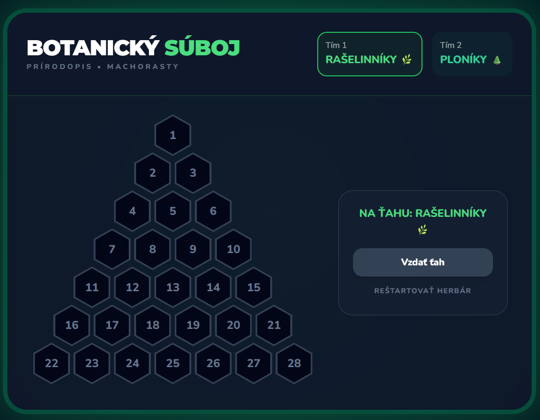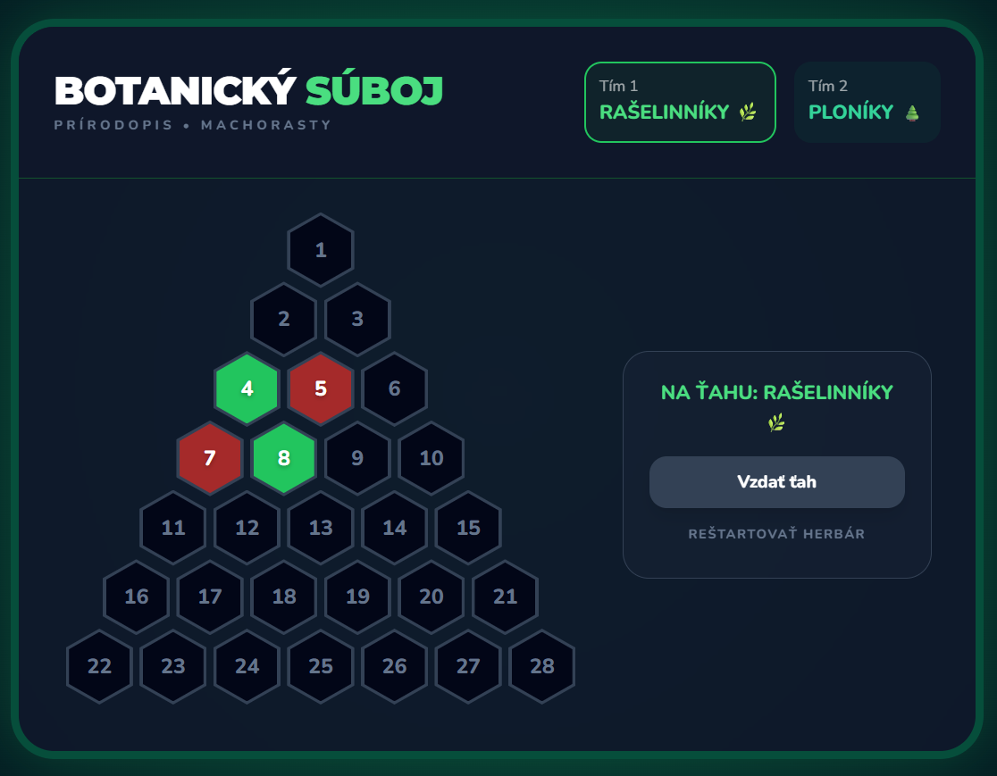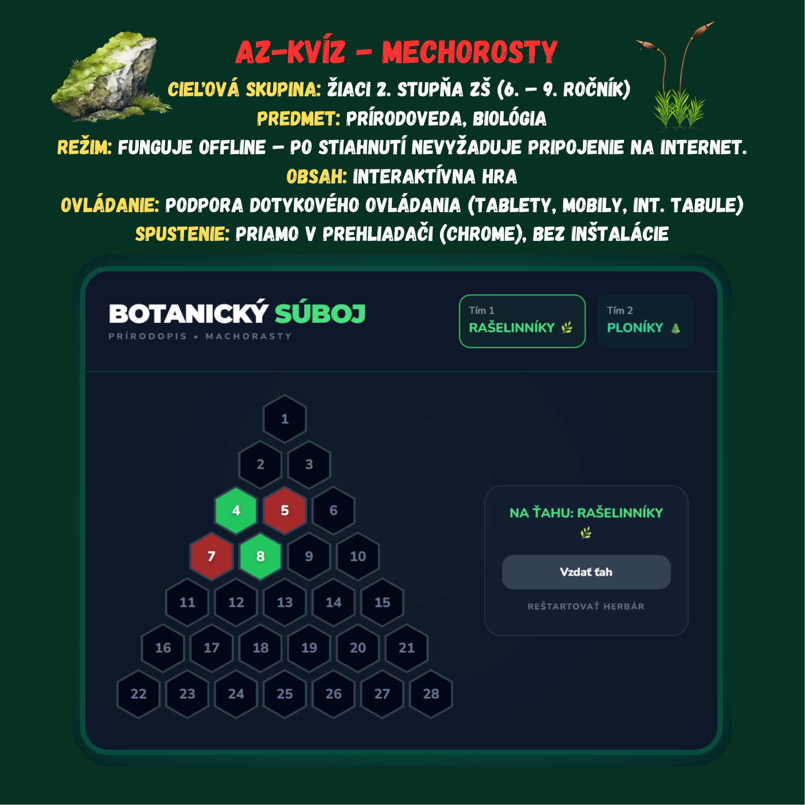Proměňte hodinu přírodopisu v napínavý souboj mezi Rašeliníky a Ploníky! Tato digitální hra přenáší oblíbený formát AZ-kvízu přímo do vaší třídy. Žáci se hravou formou ponoří do detailů ze života mechorostů, od stavby tobolky až po význam rašeliny.