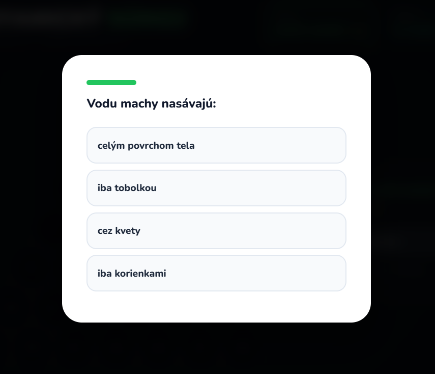 - 30 otázek: Rozdělených do témat jako stavba těla (rhizoidy, prvoklíček), rozmnožování (výtrusy, gametofyt, sporofyt) a zástupci (rašeliník, ploník, bělomech).