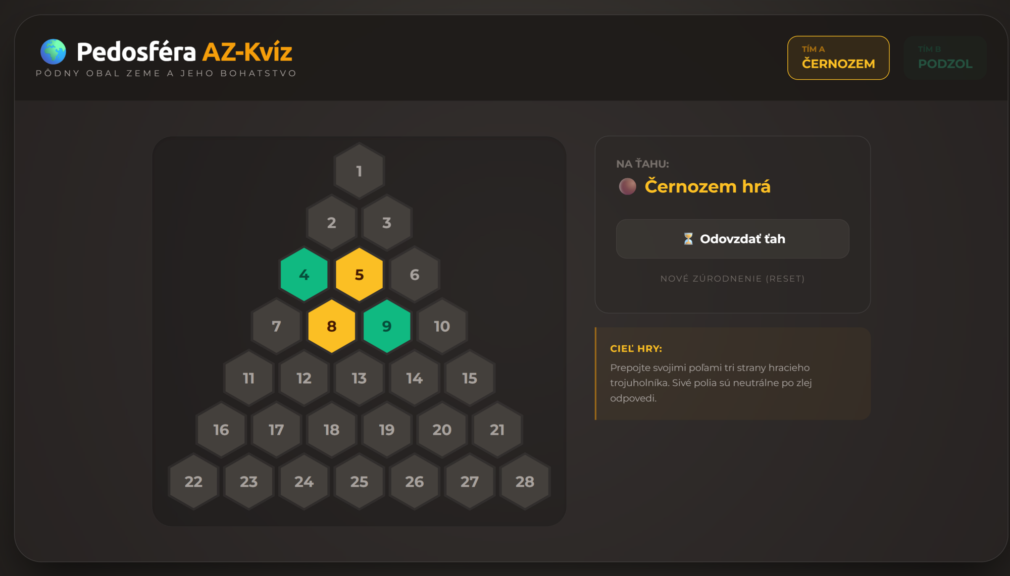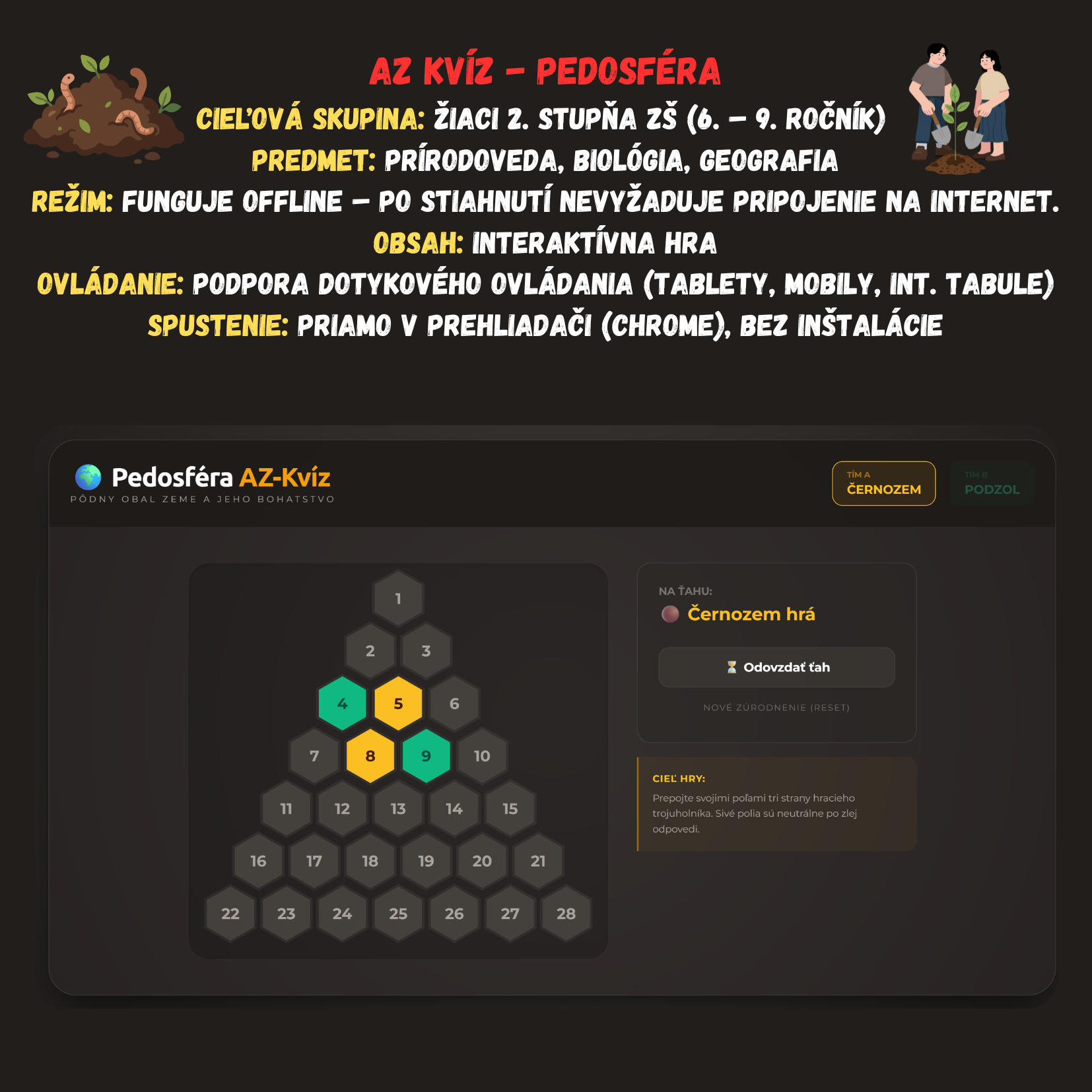 - Geografickú gramotnosť: Precvičuje znalosti o pôdnych typoch (Černozem, Podzol, Niva), druhoch a zložení pôdy.