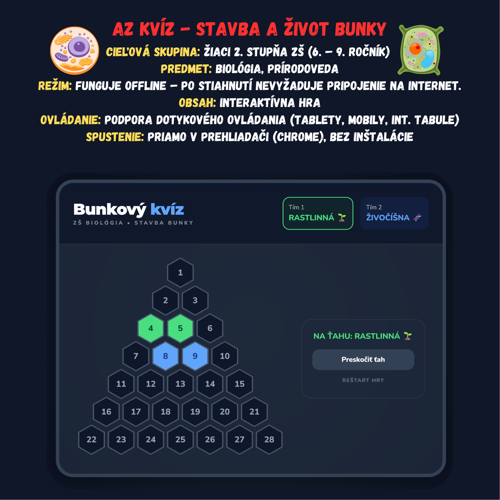 Cieľ aktivity: Precvičiť učivo o stavbe a živote bunky interaktívnou a vysoko motivujúcou formou, ktorá aktivuje celú triedu a upevní odbornú terminológiu.