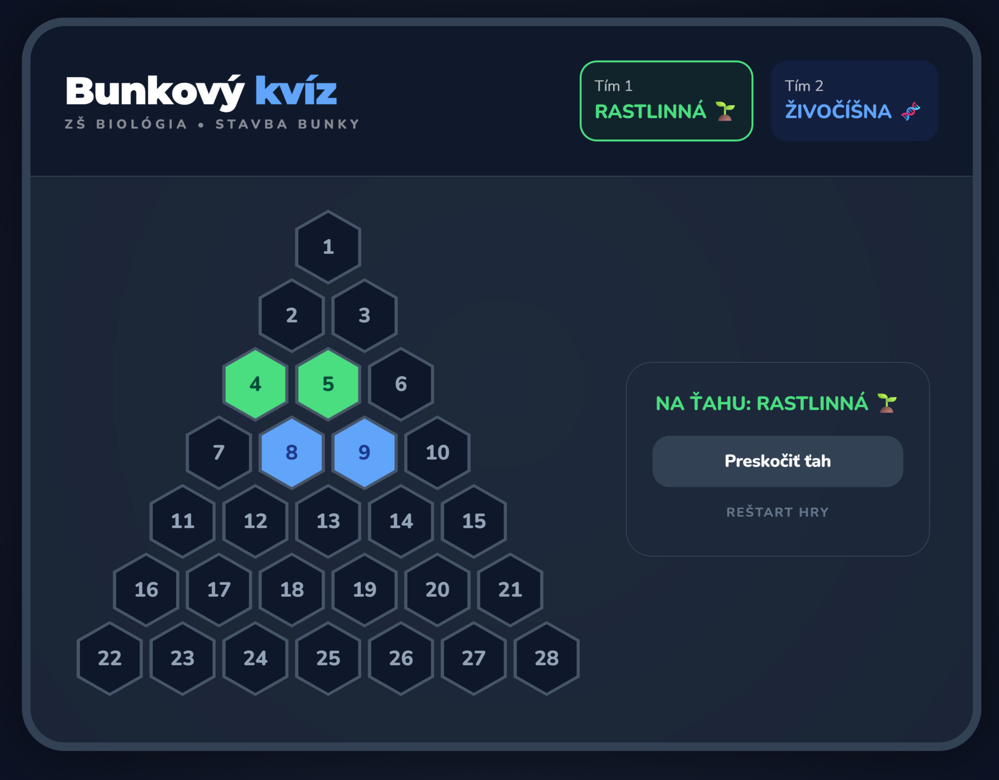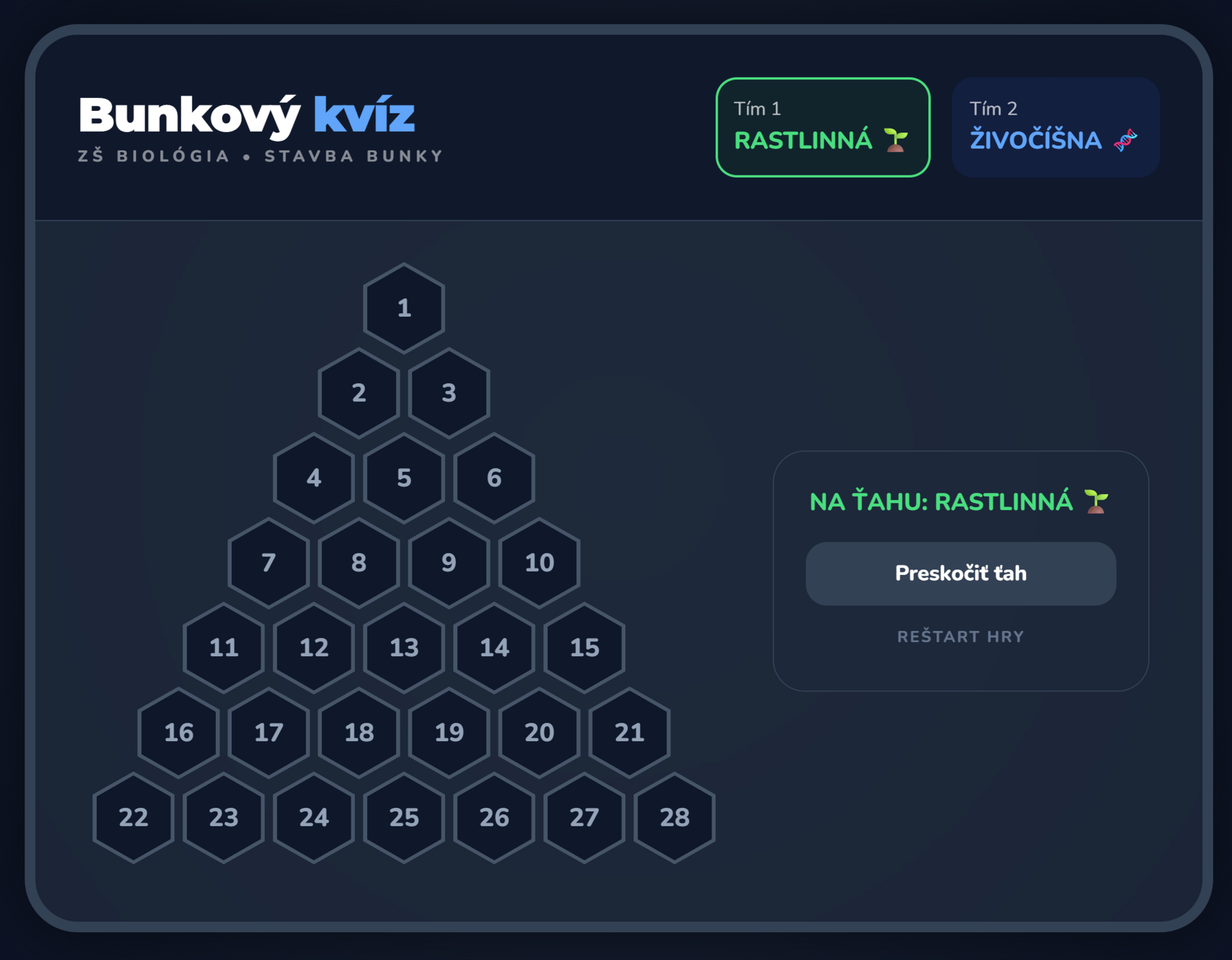 - Kompletná herná logika: Automatické striedanie dvoch tímov, interaktívne herné pole s 28 hexagónmi, zvukové efekty a vizuálna spätná väzba po každej odpovedi.