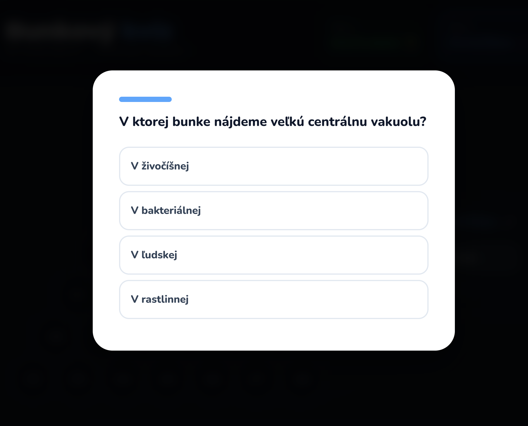 - 30 odborných otázok: Rozdelených do oblastí stavby bunky (organely ako mitochondrie, chloroplasty, vakuoly), bunkových procesov (fotosyntéza, delenie) a rozdielov medzi rastlinnou a živočíšnou bunkou.