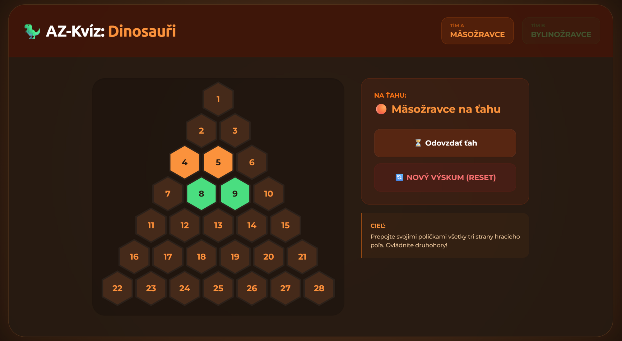- Tímový súboj: Duel medzi Mäsožravcami (oranžoví) a Bylinožravcami (zelení).