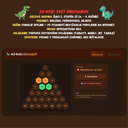 Premeňte hodinu prírodovedy alebo vlastivedy na napínavý súboj z čias druhohôr! Táto digitálna hra v štýle populárneho AZ-kvízu preverí vedomosti vašich žiakov o fascinujúcom svete dinosaurov.