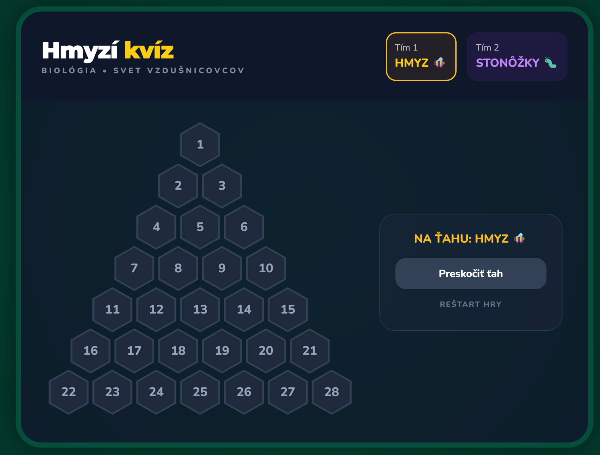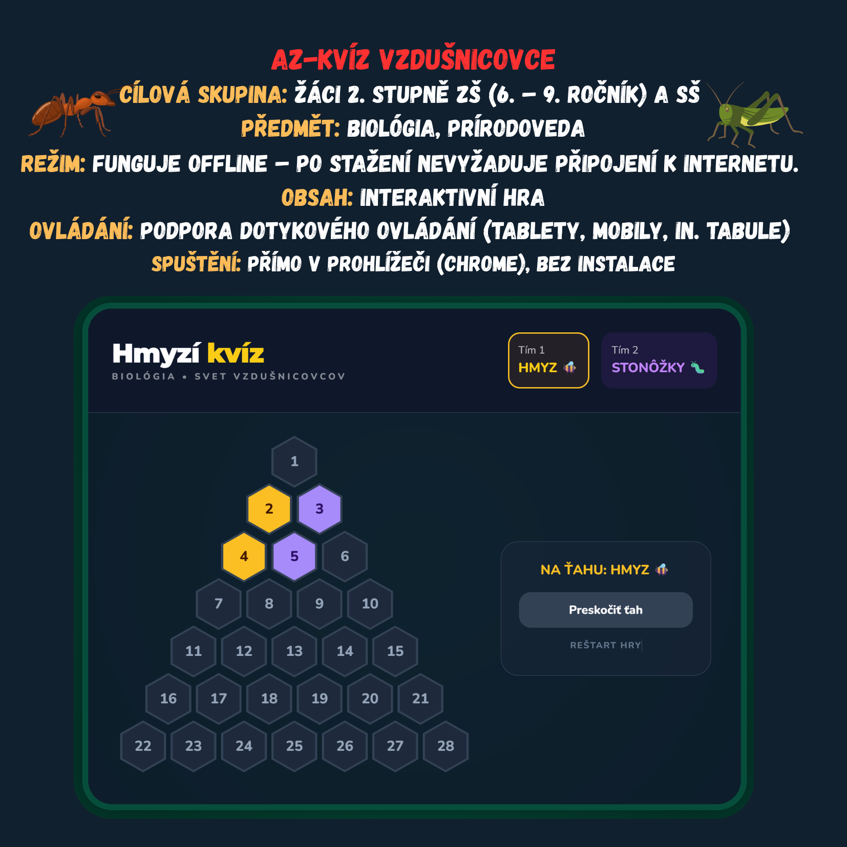 Premeňte hodinu prírodopisu na napínavý súboj medzi tímami Hmyzu a Stonôžok! Táto digitálna hra prenáša obľúbený formát televíznej súťaže AZ-kvíz priamo do vašej triedy. Žiaci sa hravou formou ponoria do detailov zo sveta vzdušnicovcov, od stavby tela až po fascinujúce premeny hmyzu.