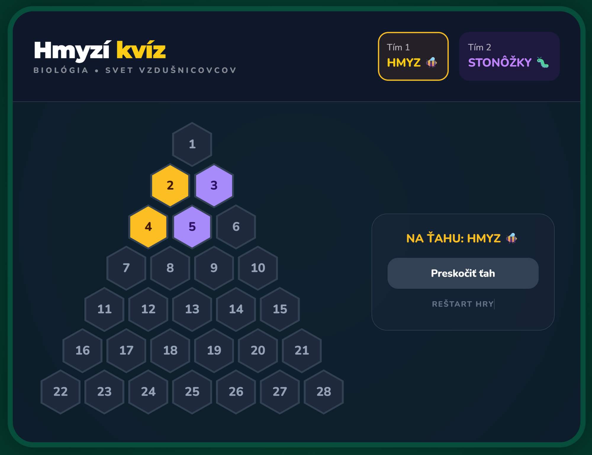 - Kompletná herná logika: Automatické striedanie dvoch tímov, vizuálne označovanie polí (žltá vs. fialová), neutrálne pole pri zlej odpovedi a interaktívne zvukové efekty.