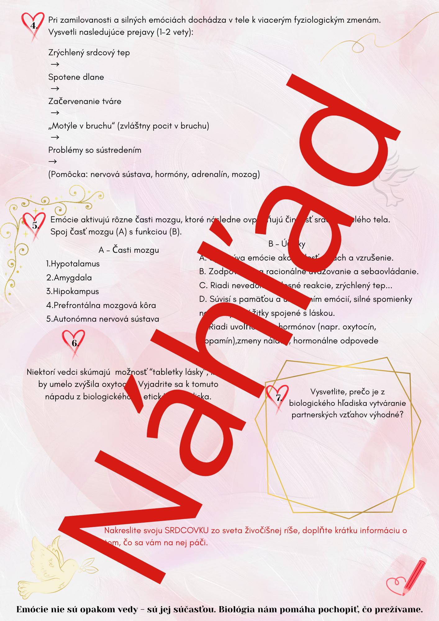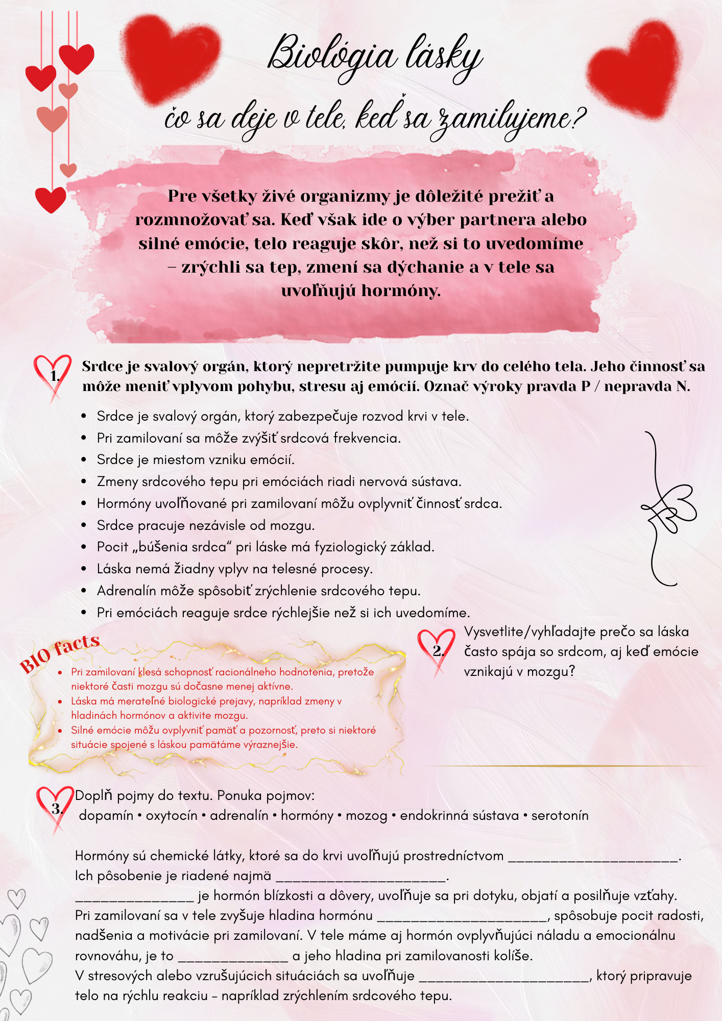 - Téma pracovného listu vychádza zo sviatku Valentína a prepája ho s biologickým vysvetlením emócií, činnosti srdca, mozgu a hormónov.