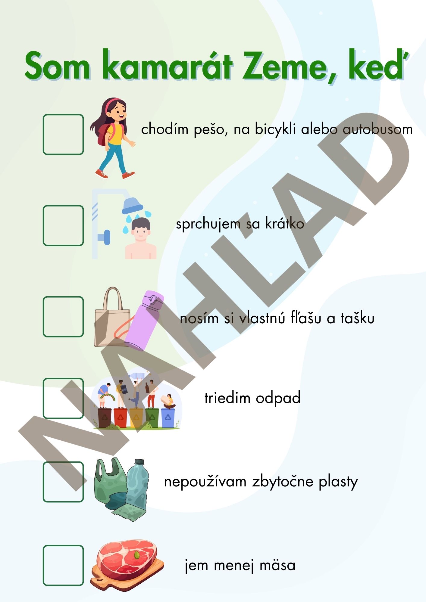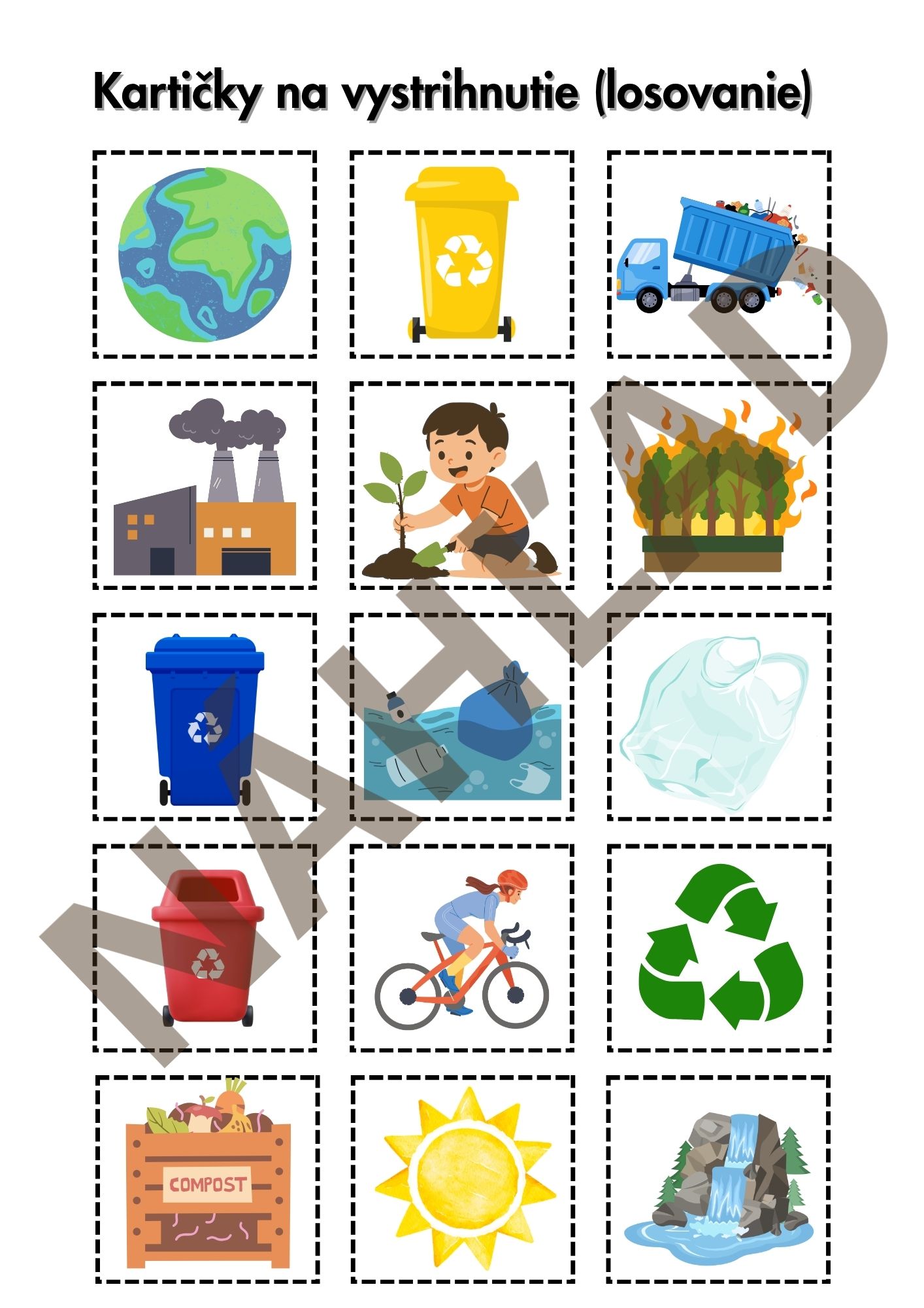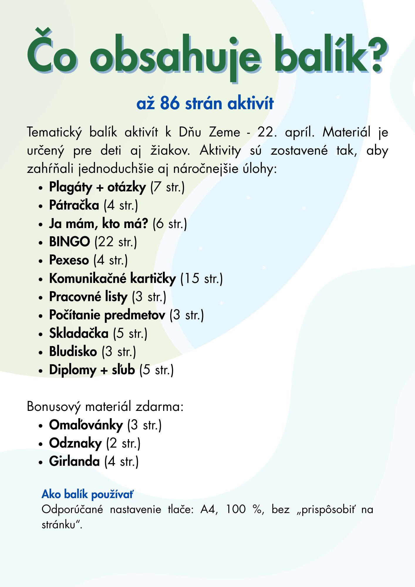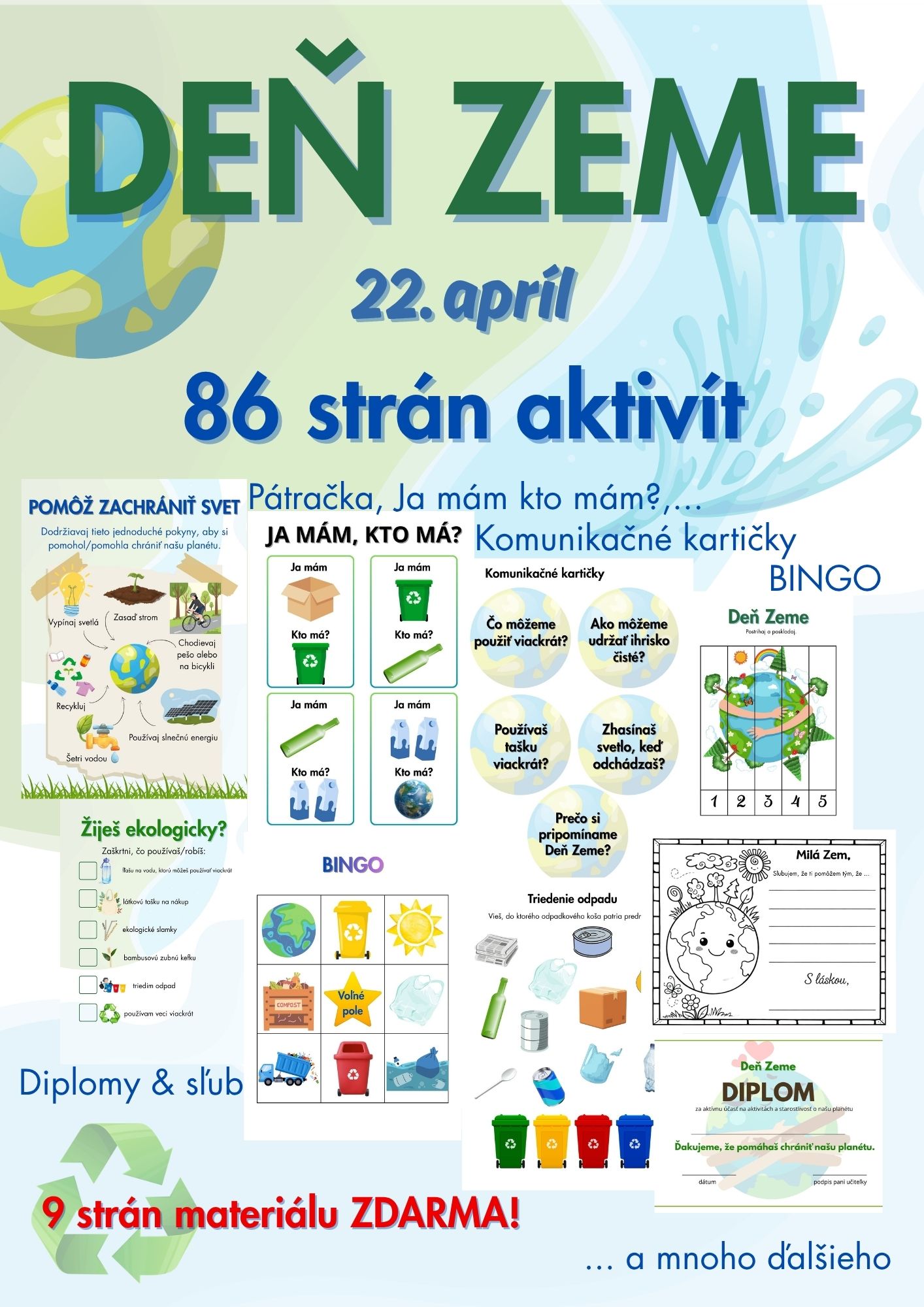 Tento tematický balík aktivít ponúka deťom a žiakom pestré úlohy, vďaka ktorým sa hravou formou učia o ochrane prírody, recyklácii, triedení odpadu a zodpovednom správaní k našej planéte. Materiál obsahuje jednoduchšie aj náročnejšie aktivity, a preto je vhodný pre rôzne vekové skupiny. Je ideálny na tematické vyučovanie, projektové dni aj bežnú prácu v triede.