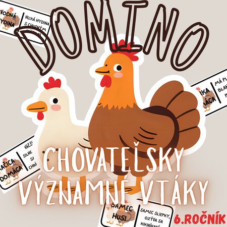 Materiál Domino – Chovateľsky významné vtáky je zábavno-vzdelávacia aktivita, ktorá pomáha žiakom 6. ročníka základnej školy zopakovať a upevniť učivo o domácich a hospodárskych vtákoch, ich význame pre človeka a produktoch, ktoré poskytujú.