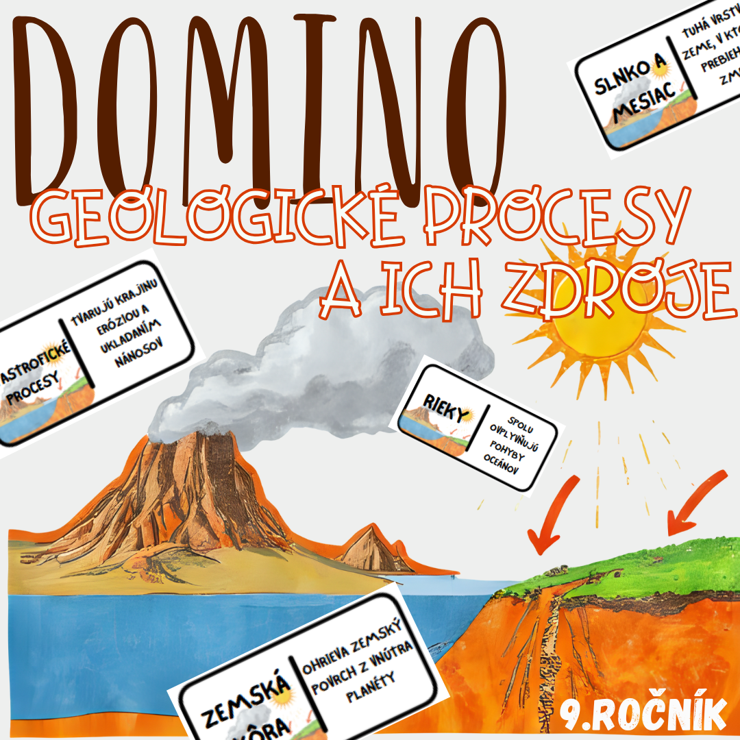 Materiál Domino – Geologické procesy a ich zdroje je interaktívna a hravá aktivita, ktorá pomáha žiakom 9. ročníka základnej školy upevniť a prepojiť poznatky o vnútorných (endogénnych) a vonkajších (exogénnych) geologických procesoch, ich zdrojoch energie a vplyve na tvarovanie zemského povrchu.