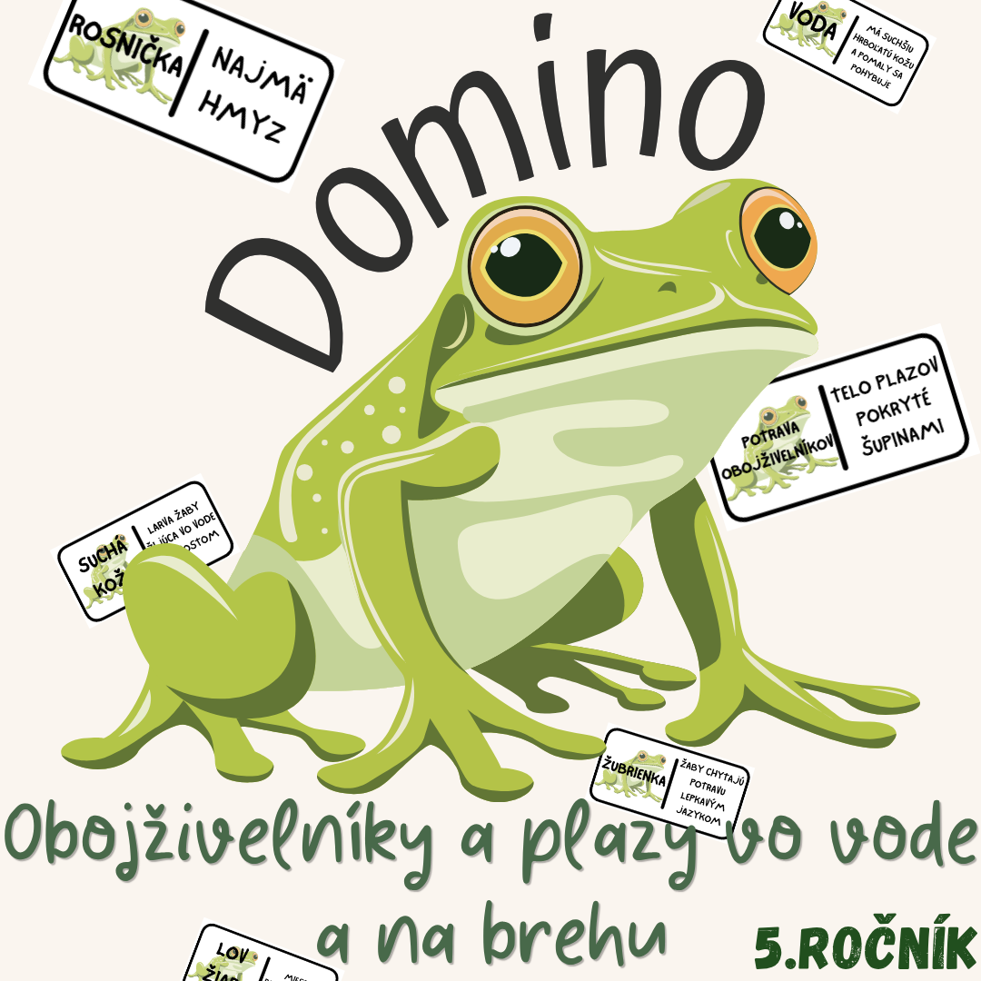 Materiál „Domino – Obojživelníky a plazy vo vode a na brehu“ je didaktická a názorná edukačná aktivita určená pre žiakov 5. ročníka základnej školy na hodiny biológie. Tematicky je zameraná na poznávanie obojživelníkov a plazov, ich stavbu tela, spôsob dýchania, rozmnožovanie a prispôsobenie sa prostrediu.