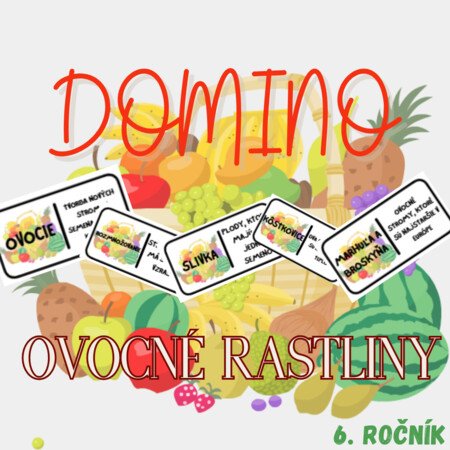 Hravá vzdelávacia aktivita DOMINO: Ovocné rastliny je ideálna pomôcka pre učiteľov biológie na 2. stupni ZŠ, najmä v 6. ročníku. Vďaka prehľadnému spracovaniu a stručným popisom si žiaci zábavnou formou precvičia typy ovocných plodov, rozdelenie ovocných rastlín a spoznajú ich kľúčových zástupcov (napr. jabloň, slivka, ríbezľa).