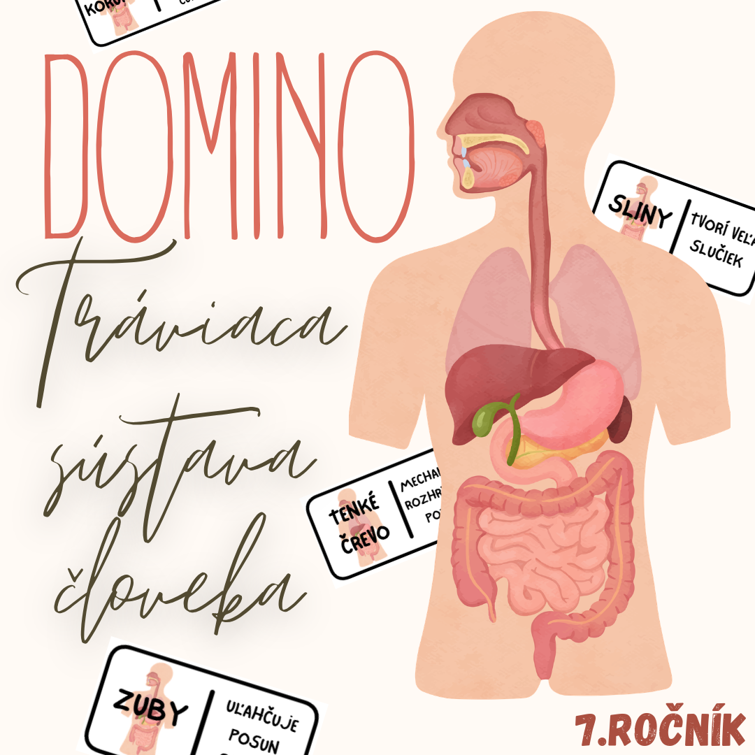 Materiál „Domino – Tráviaca sústava človeka“ je didaktická a názorná edukačná aktivita určená pre žiakov 7. ročníka základnej školy na hodiny biológie. Aktivita je spracovaná k téme tráviaca sústava človeka a pomáha žiakom pochopiť stavbu jednotlivých orgánov a proces trávenia potravy.