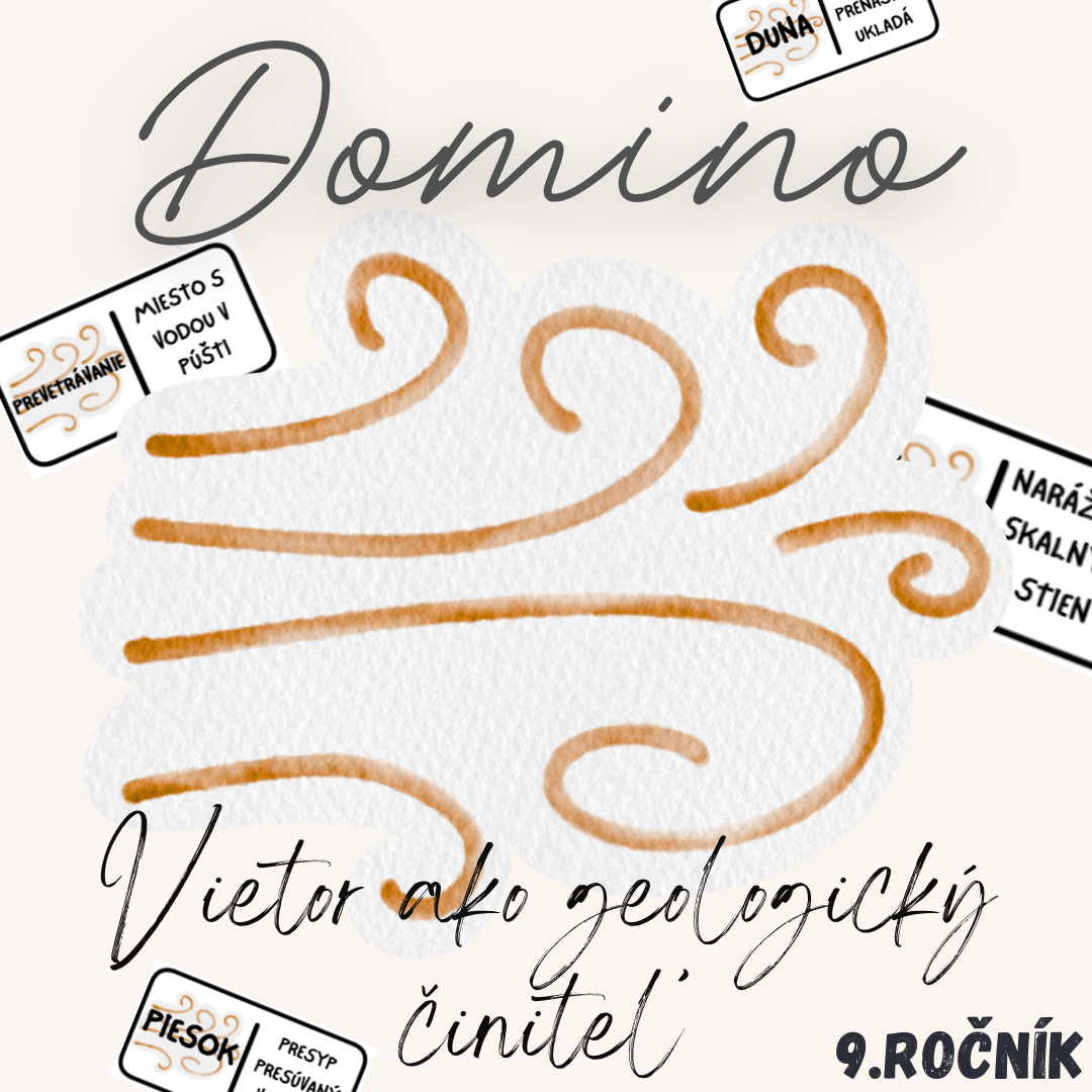 Materiál „Domino – Vietor ako geologický činiteľ“ je didaktická a názorná edukačná aktivita určená pre žiakov 9. ročníka základnej školy na hodiny biológie. Aktivita je spracovaná k téme Vietor ako geologický činiteľ a pomáha žiakom pochopiť jeho pôsobenie na zemský povrch, procesy, ktoré spôsobuje, a tvary reliéfu, ktoré pri jeho činnosti vznikajú.