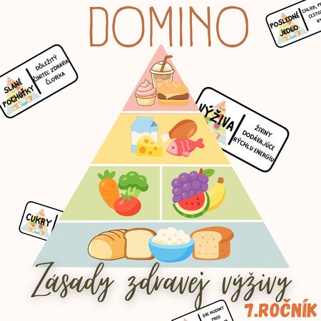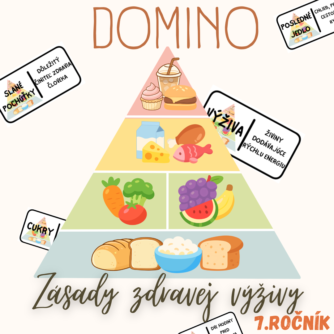 Materiál „Domino – Zásady zdravej výživy“ je didaktická a názorná edukačná aktivita určená pre žiakov 7. ročníka základnej školy na hodiny biológie. Aktivita je spracovaná k téme zdravý životný štýl a pomáha žiakom pochopiť princípy správneho stravovania a ich význam pre ľudský organizmus.