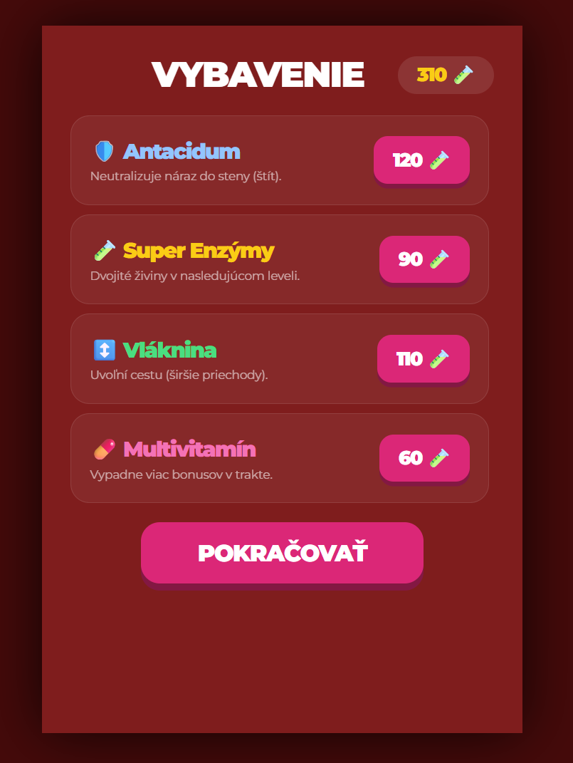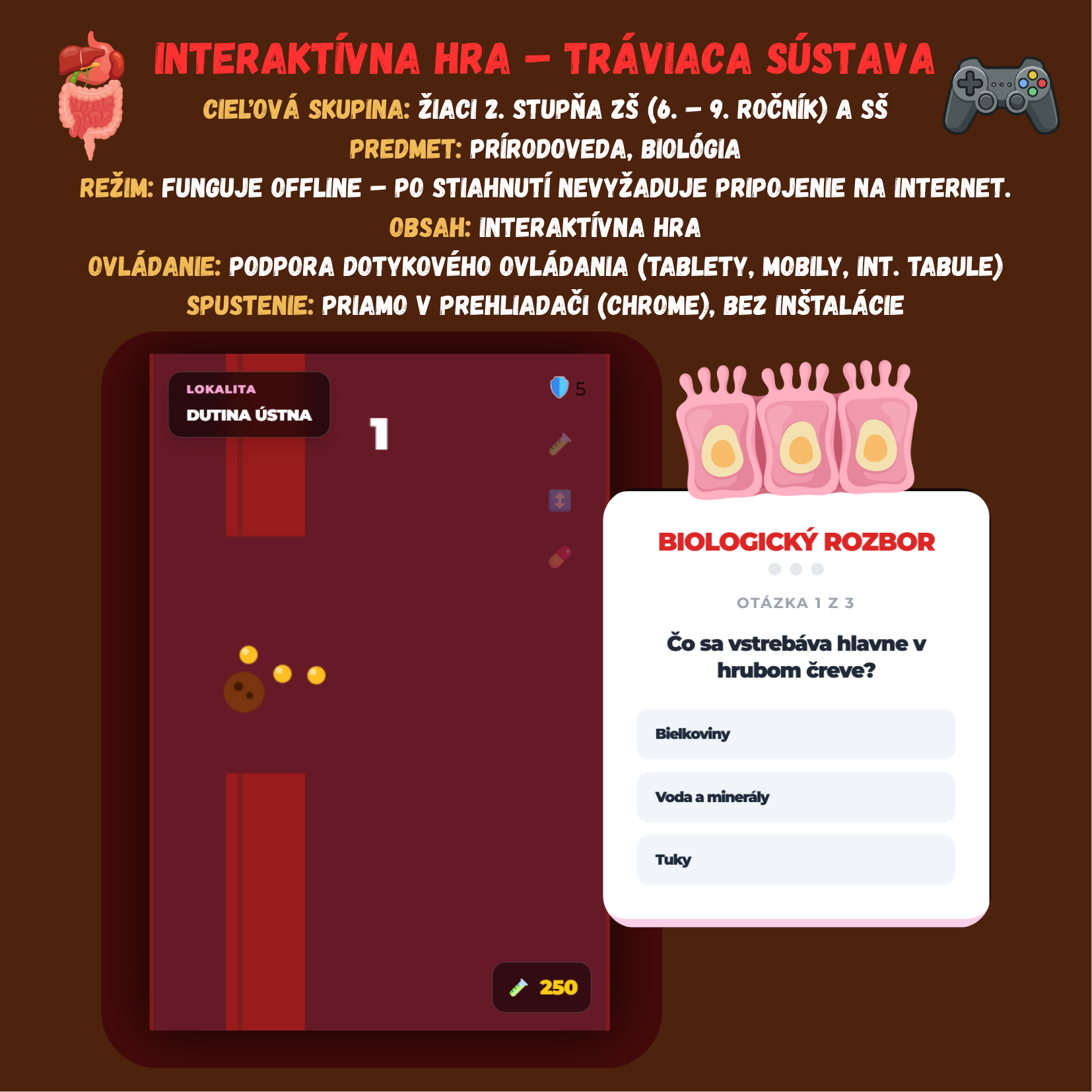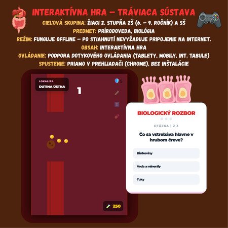 Premeňte hodinu biológie na napínavú expedíciu ľudským telom! Táto digitálna hra kombinuje populárny postrehový žáner s hĺbkovým kvízom o tráviacej sústave. Žiaci sa v roli sústa navigujú cez nástrahy tráviaceho traktu, od rozmeľňovania v ústach až po procesy v črevách.