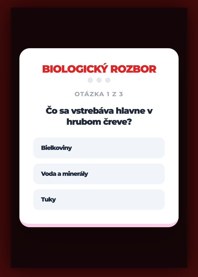 - Vizuálna spätná väzba: Po každej odpovedi sa zobrazí správne riešenie, čo zaisťuje vzdelávací efekt aj pri chybnej voľbe.