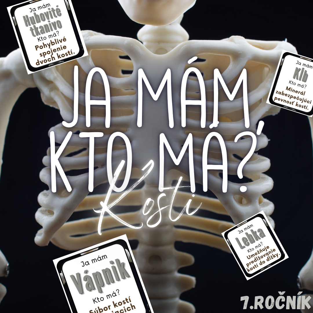 Materiál „Ja mám, kto má? – Kosti“ je dynamická a interaktívna edukačná aktivita určená pre žiakov 7. ročníka základnej školy na hodiny biológie. Hravou formou pomáha zopakovať, upevniť a prehĺbiť poznatky o kostre človeka, jednotlivých typoch kostí a ich funkciách v ľudskom tele.