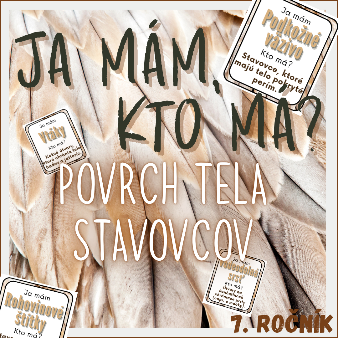 Materiál Ja mám, kto má? – Krycia sústava stavovcov je interaktívna a hravá aktivita, ktorá pomáha žiakom 7. ročníka zopakovať základné pojmy o povrchu tela stavovcov, ich koži a špecializovaných útvaroch (perie, srsť, šupiny, atď.).
