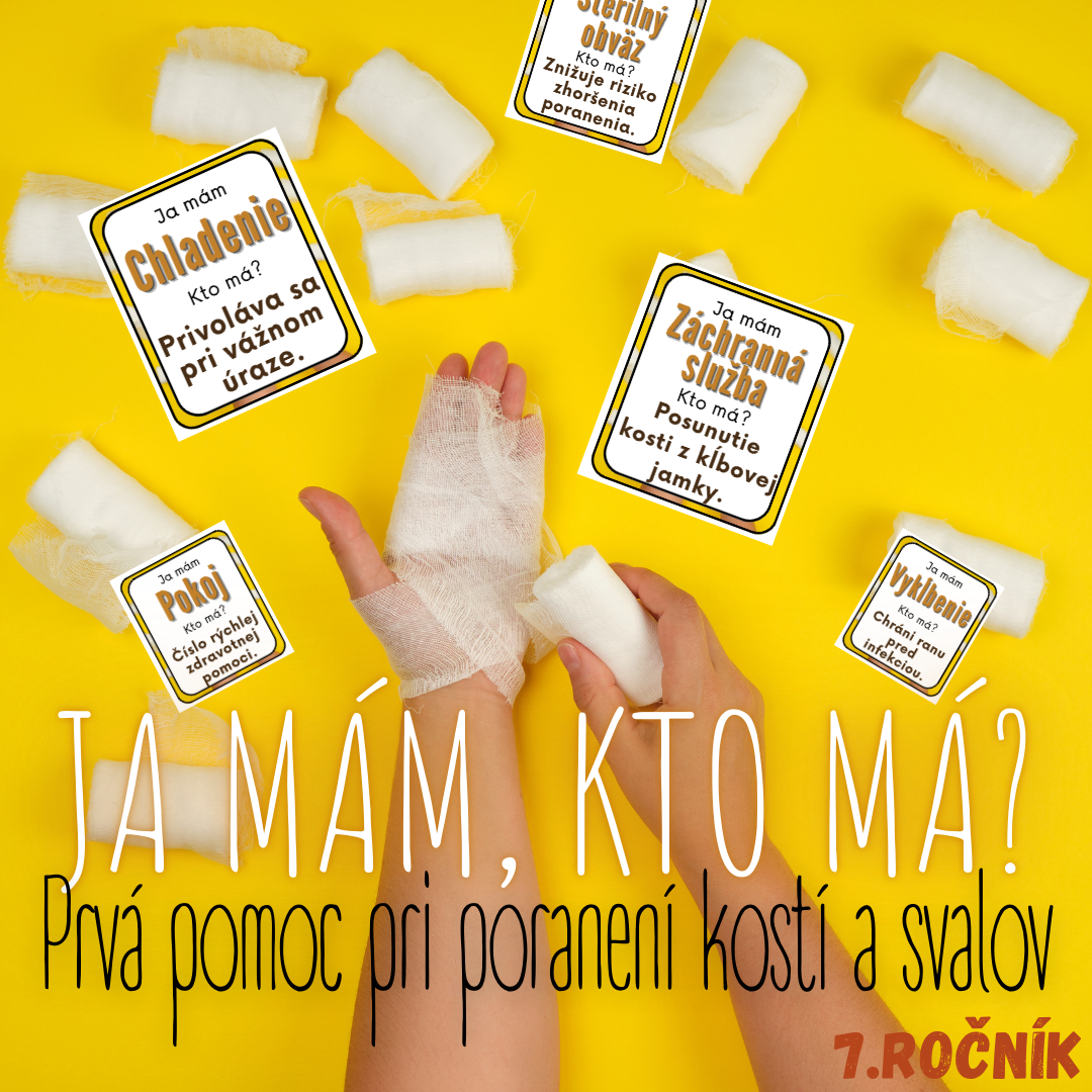 Materiál „Ja mám, kto má? – Prvá pomoc pri poranení kostí a svalov“ je dynamická a interaktívna edukačná aktivita určená pre žiakov 7. ročníka základnej školy na hodiny biológie. Aktivita je spracovaná k téme prvá pomoc pri úrazoch opornej a pohybovej sústavy a hravou formou pomáha zopakovať, upevniť a prehĺbiť poznatky o správnom postupe pri poraneniach kostí a svalov.