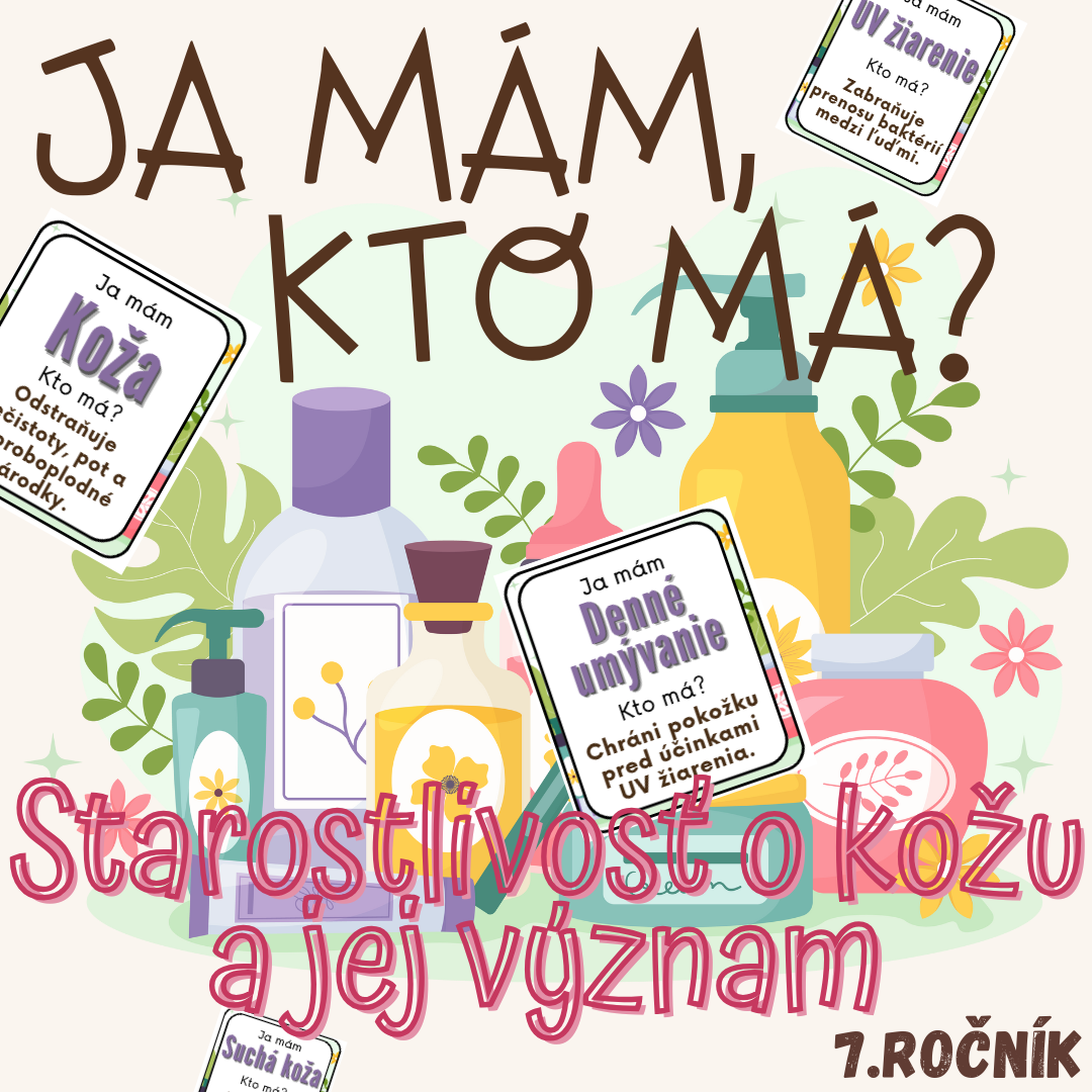 Materiál „Ja mám, kto má? – Starostlivosť o kožu a jej význam“ je interaktívna kartová hra určená pre žiakov 7. ročníka základnej školy. Hravou a dynamickou formou pomáha zopakovať, upevniť a prehĺbiť poznatky o koži ako dôležitom orgáne ľudského tela, o jej ochranných funkciách a zásadách správnej starostlivosti o pokožku.