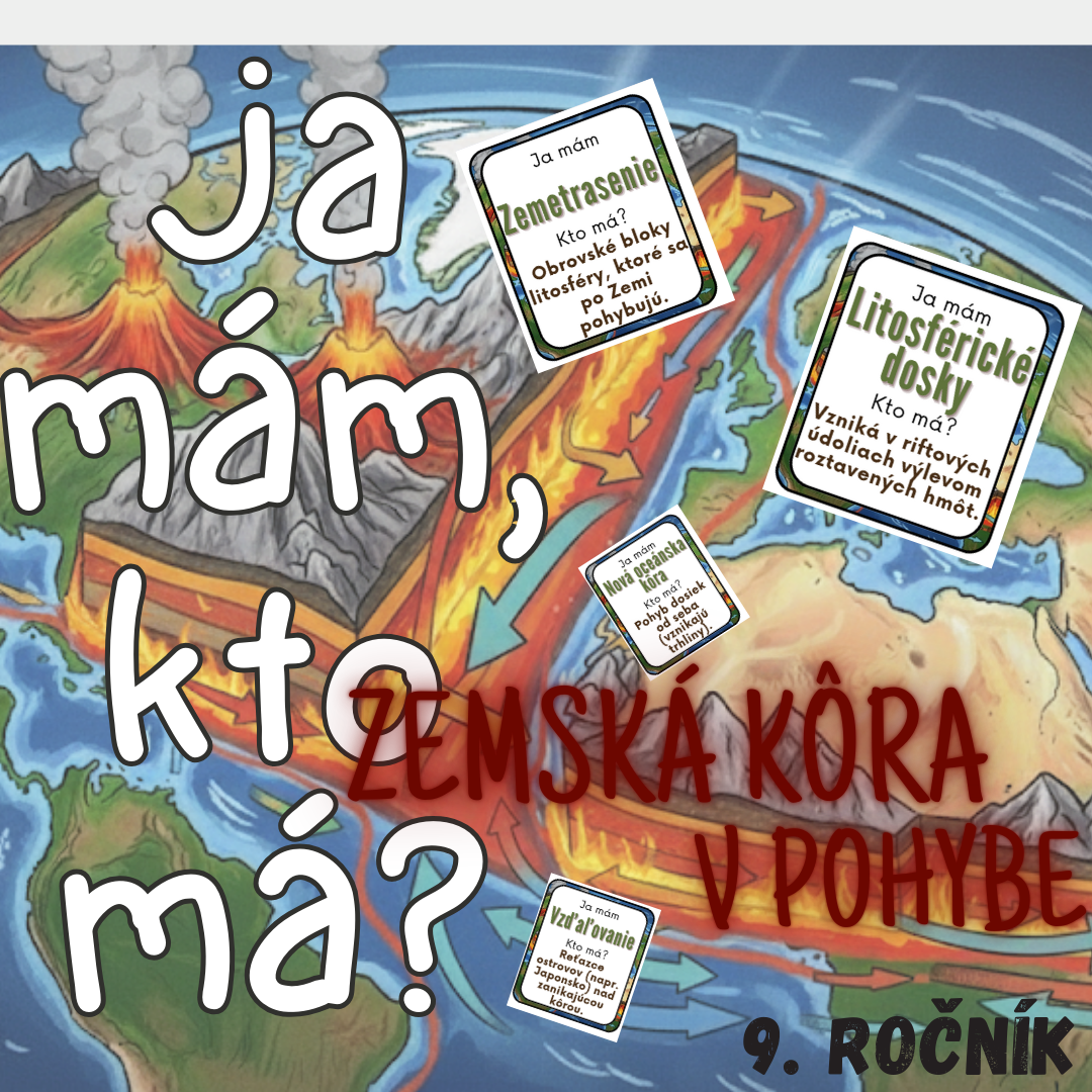 Materiál Ja mám, kto má? – Zemská kôra v pohybe je interaktívna a hravá aktivita, ktorá pomáha žiakom 9. ročníka zopakovať základné pojmy o tektonike, pohybe litosférických dosiek, zemetraseniach a sopečnej činnosti.