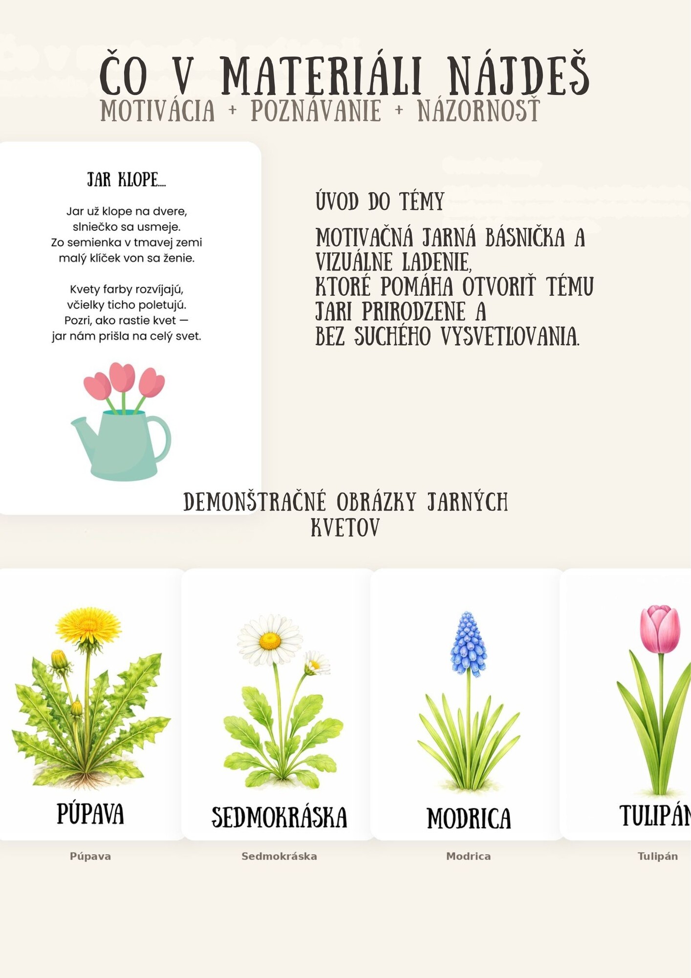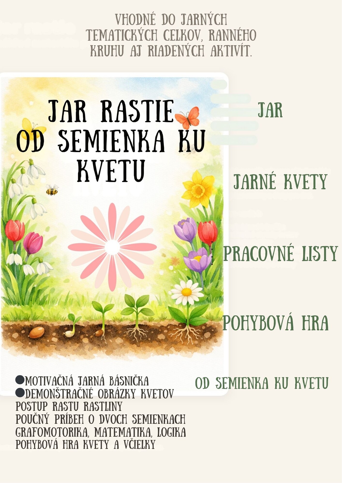 Tematický materiál pre materské školy zameraný na jar, jarné kvety a rast rastliny od semienka až po kvet. PDF je vhodné na ranné kruhy, riadené aktivity, rozhovory s deťmi aj samostatnú prácu.