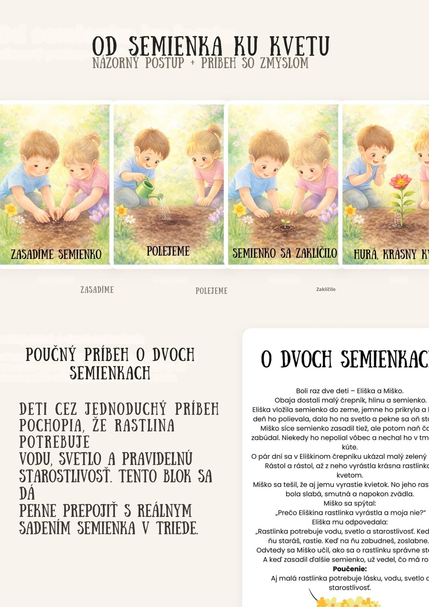 V materiáli nájdete motivačnú jarnú básničku, demonštračné obrázky jarných kvetov, názorný postup rastu rastliny krok za krokom aj poučný príbeh o dvoch semienkach, cez ktorý deti prirodzene pochopia, čo rastlina potrebuje, aby mohla rásť.
