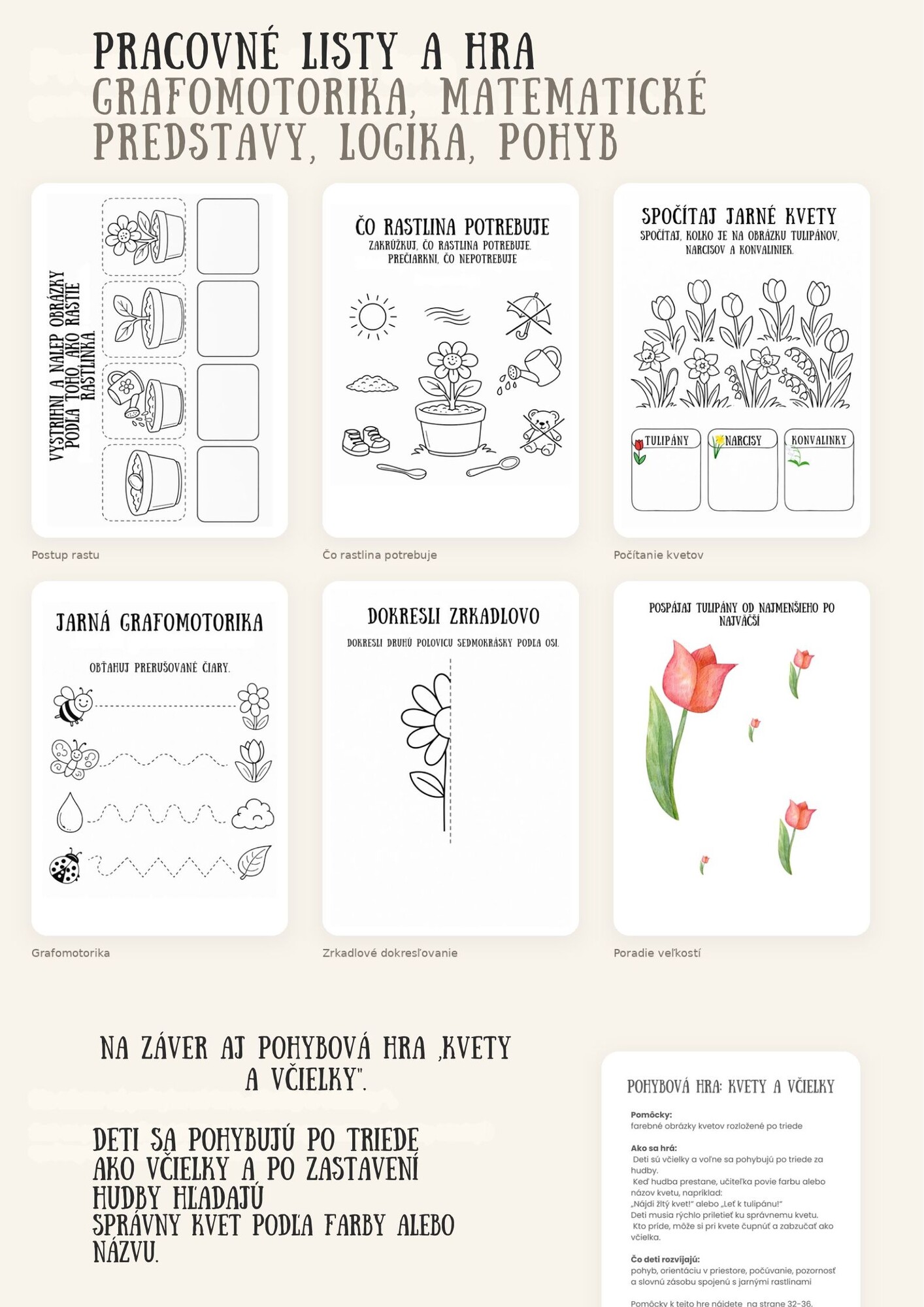 Na záver materiál obsahuje aj pohybovú hru „Kvety a včielky“, vďaka ktorej môžete tému preniesť aj do pohybu a zážitkového učenia.