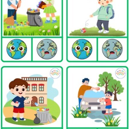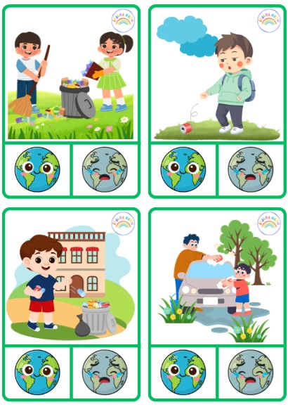 Úlohou dieťaťa je rozhodnúť či situácia na obrázku je pre našu Zem (životné prostredie) prospešná, alebo škodlivá.