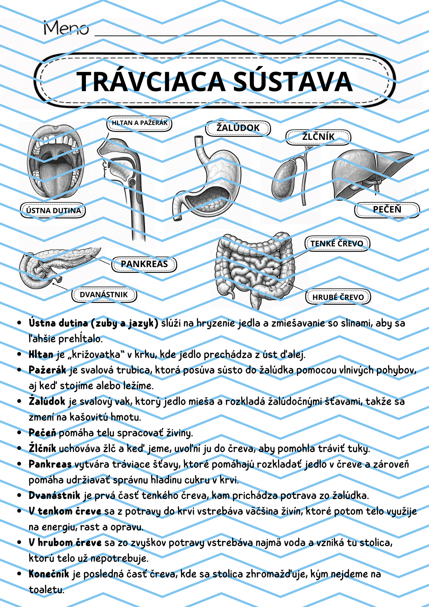 V materiáli nájdeš prehľadné obrázky jednotlivých orgánov a pri každom z nich krátky, jasný popis: čo to je, kam patrí a hlavne akú funkciu v tele plní. Vďaka tomu si žiaci ľahšie zapamätajú učivo, vedia sa rýchlo zorientovať a majú všetko pokope – bez hľadania po učebnici či internete.