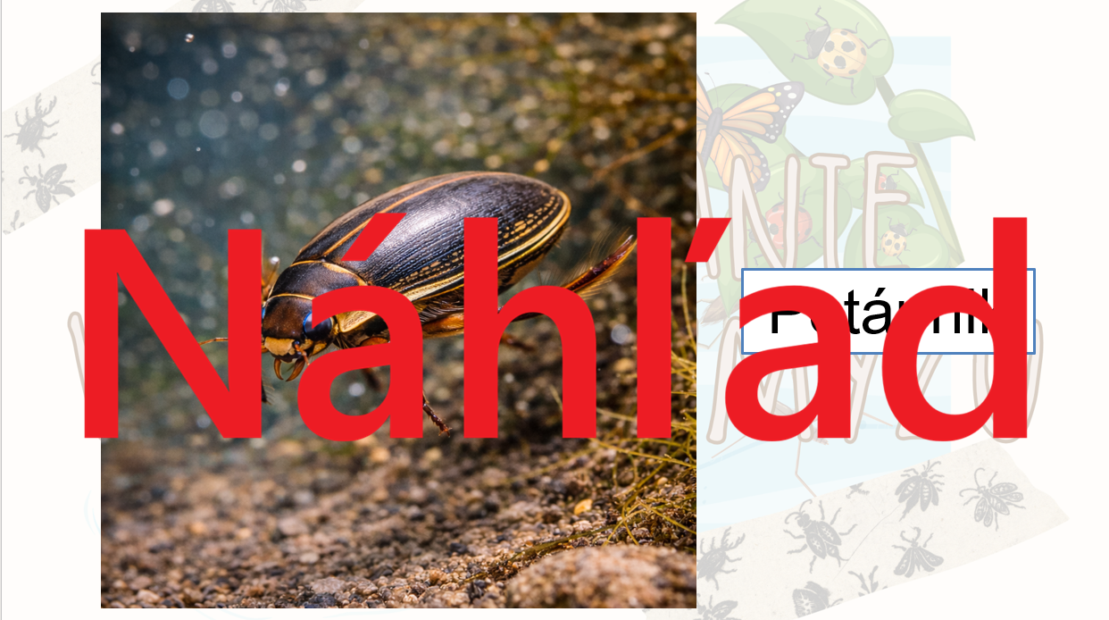 Materiál „Poznávanie vodného hmyzu“ je interaktívna edukačná prezentácia určená na praktické určovanie druhov podľa obrázkov. Obsahuje fotografie 7 vybraných druhov vodného hmyzu, pričom po kliknutí na snímku sa zobrazí názov daného organizmu.