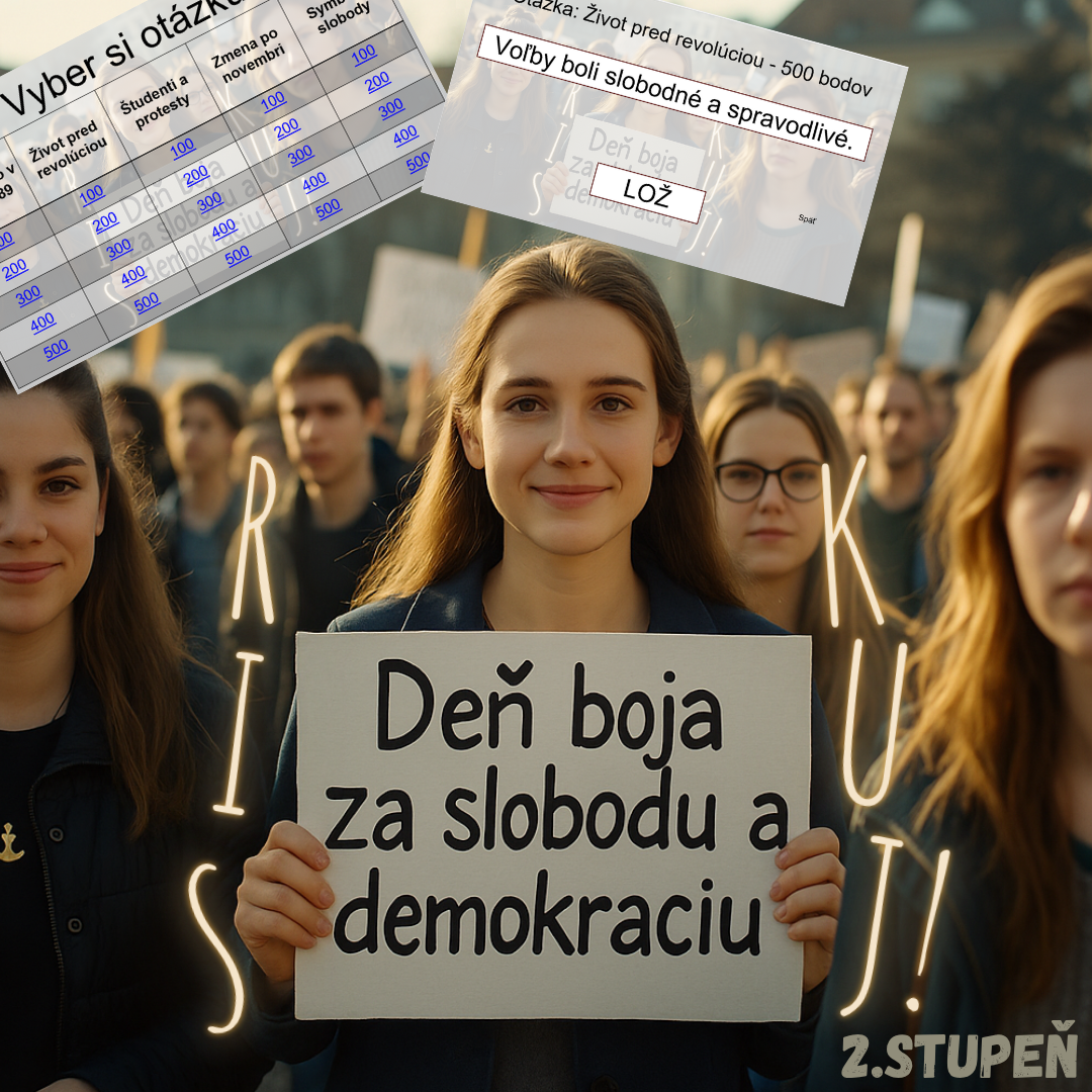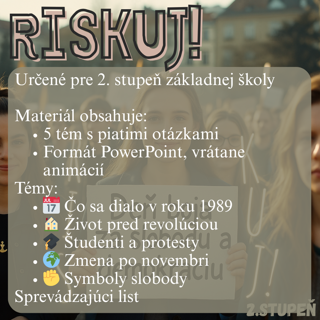 Materiál RISKUJ! – 17. november – Deň boja za slobodu a demokraciu je interaktívna a zážitková hra, ktorá žiakom pomáha pochopiť význam Nežnej revolúcie a hodnôt slobody, odvahy a demokracie.