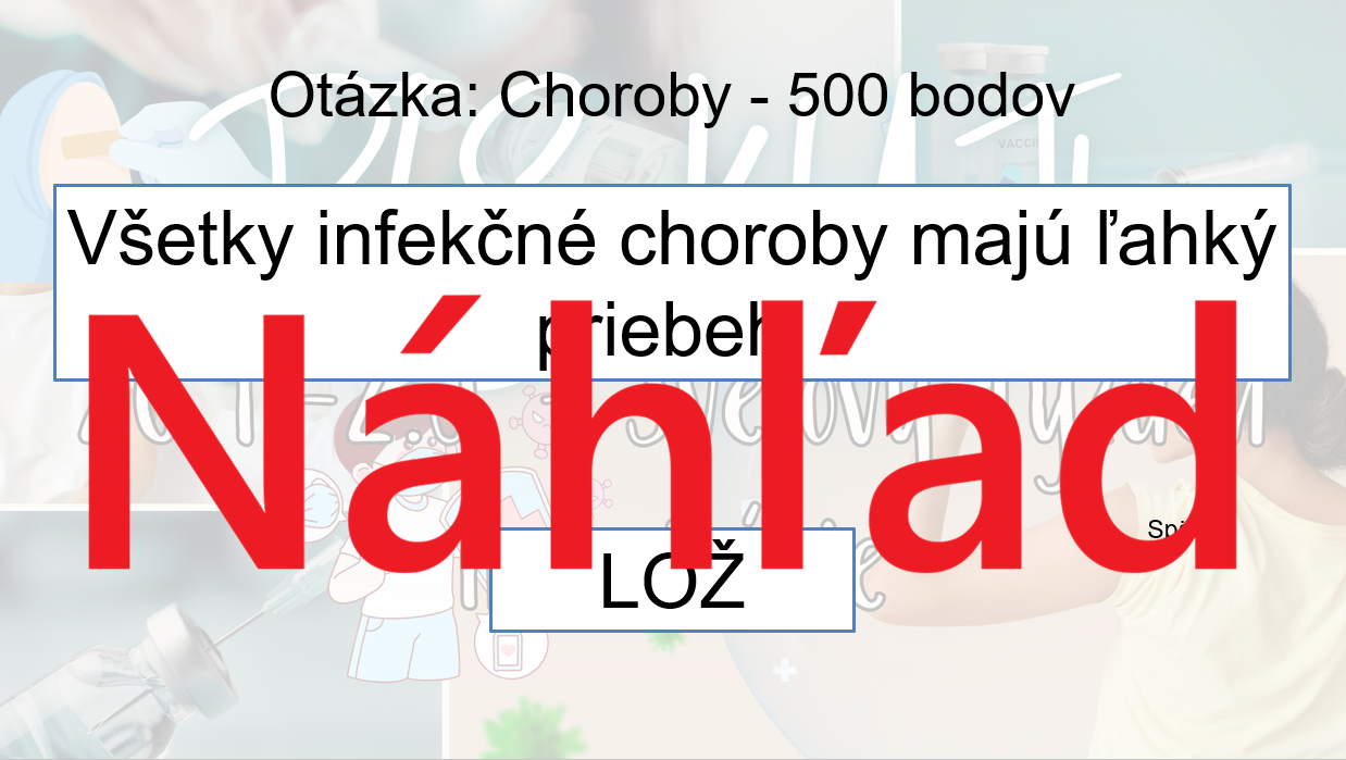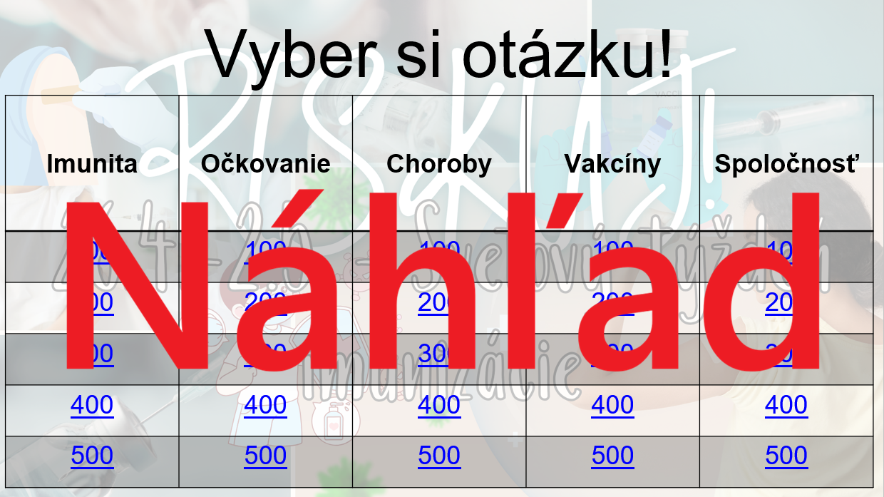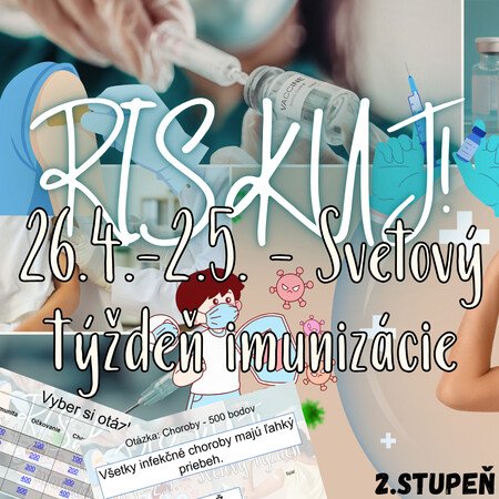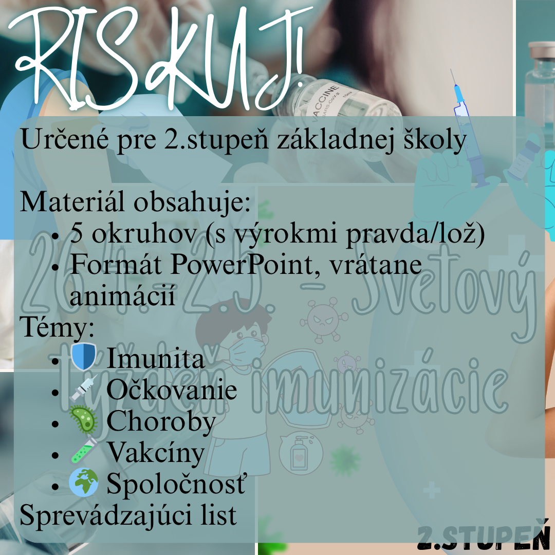 Materiál „RISKUJ! – Svetový týždeň imunizácie“ je interaktívna a súťažná edukačná hra určená pre žiakov 2. stupňa základnej školy. Zameriava sa na význam imunity, očkovania a prevencie infekčných ochorení.