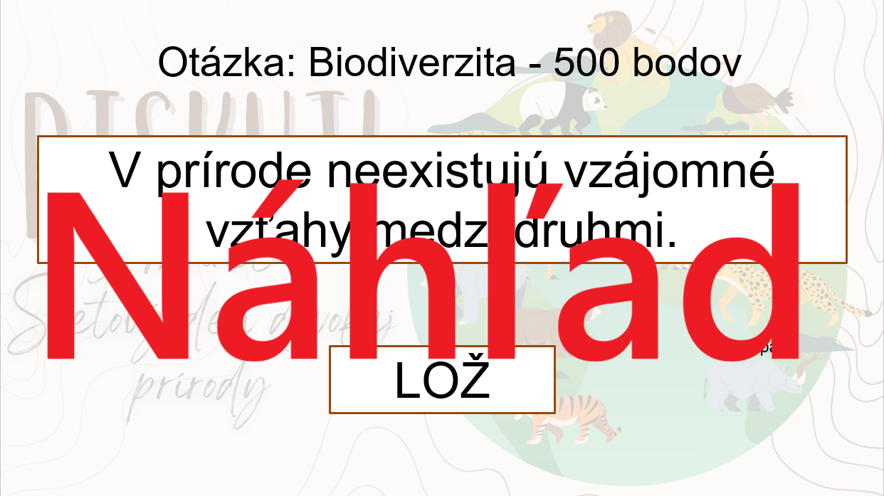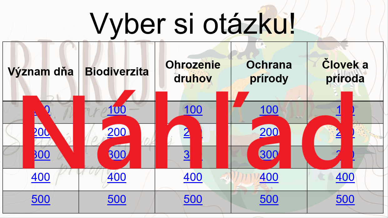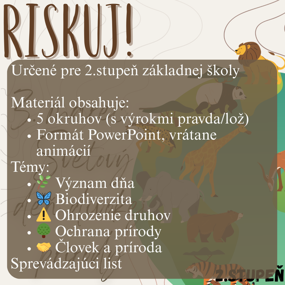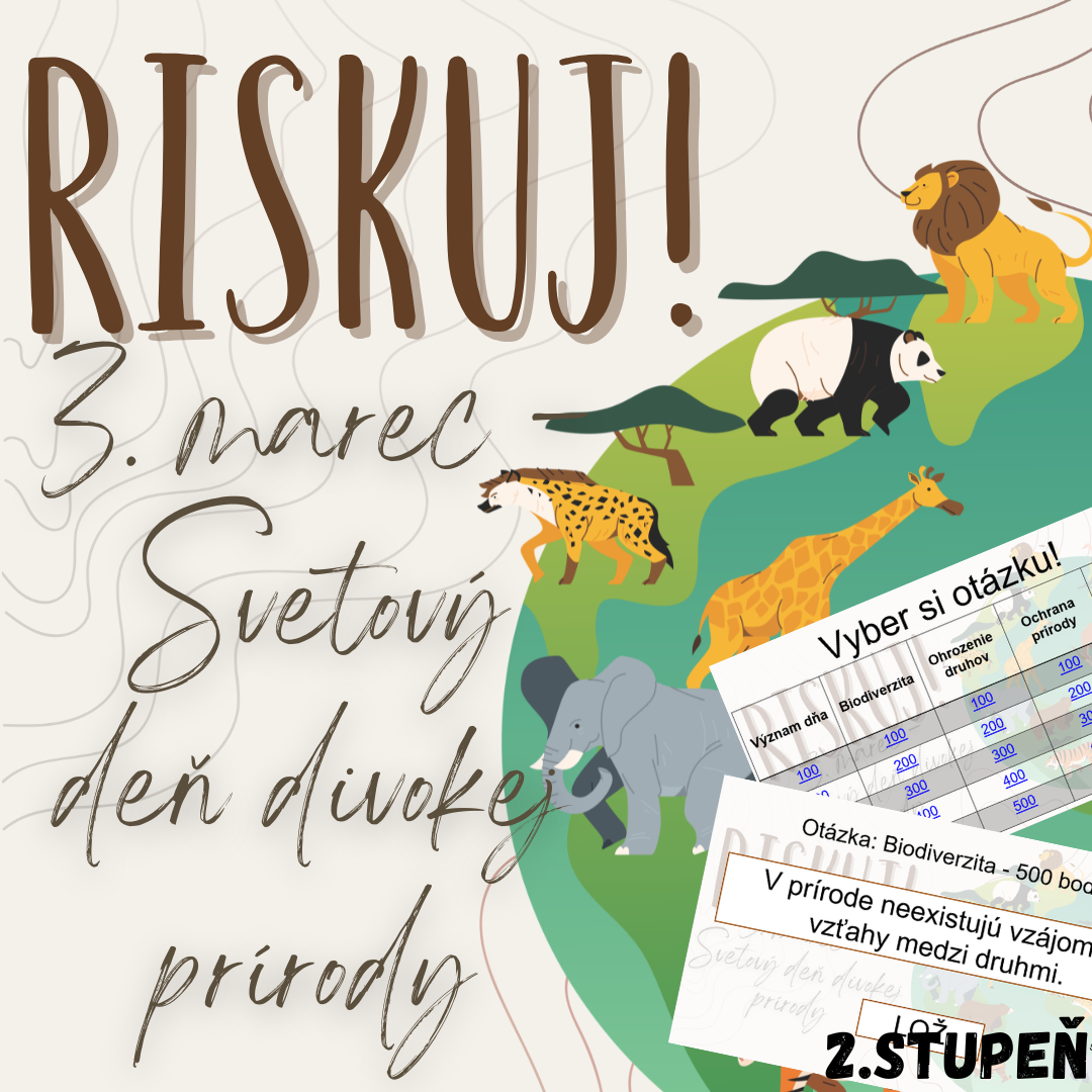 Materiál „RISKUJ! – 3. marec: Svetový deň divokej prírody“ je interaktívna a súťažná edukačná hra určená pre žiakov 2. stupňa základnej školy. Aktivita je tematicky zameraná na význam Svetového dňa divokej prírody a hravou formou pomáha zopakovať, upevniť a prehĺbiť poznatky o biodiverzite, ohrozených druhoch a ochrane prírody.